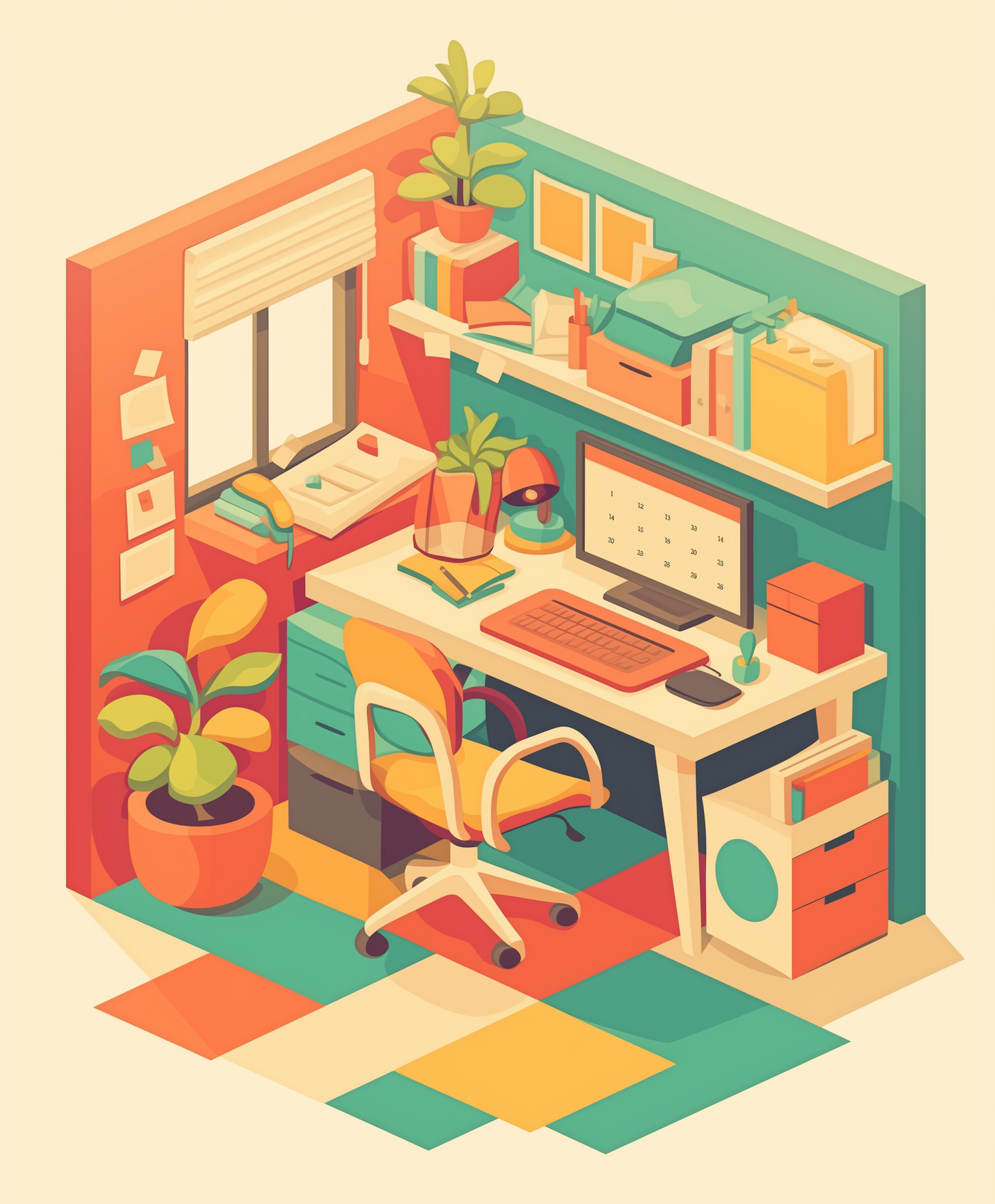 Colorful home office illustration with desk, computer, plants, and books. Vibrant orange and teal walls create a lively workspace.