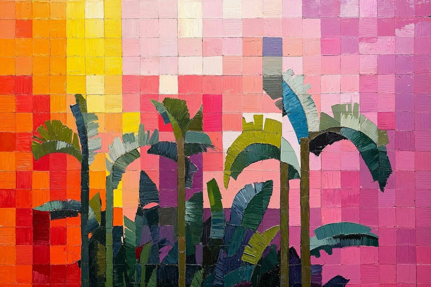 Vibrant painting of stylized palm trees against a colorful mosaic background with warm reds, oranges, pinks, and purples.