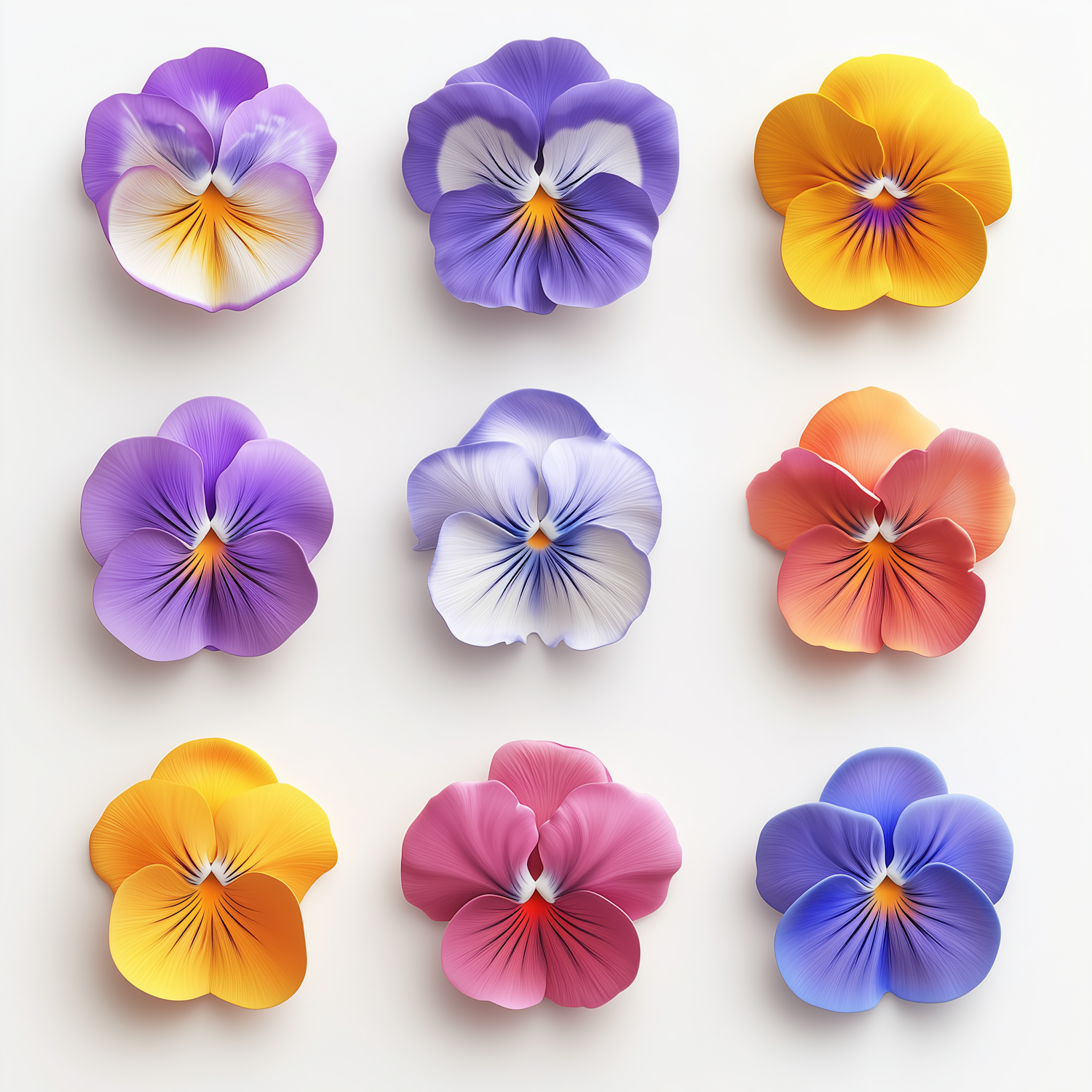 A vibrant grid of colorful pansy flowers in purple, yellow, pink, and blue hues, beautifully detailed against a clean white background.