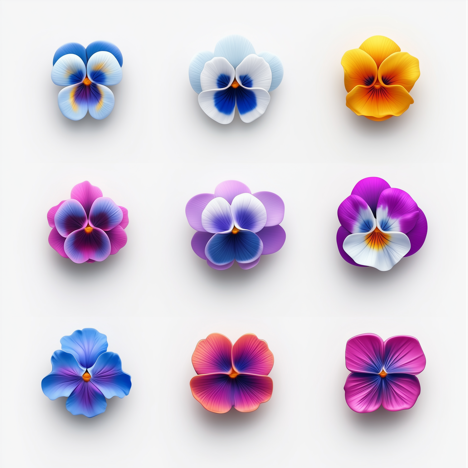 A vibrant grid of nine colorful pansy flowers with intricate petal details, set against a clean white background.