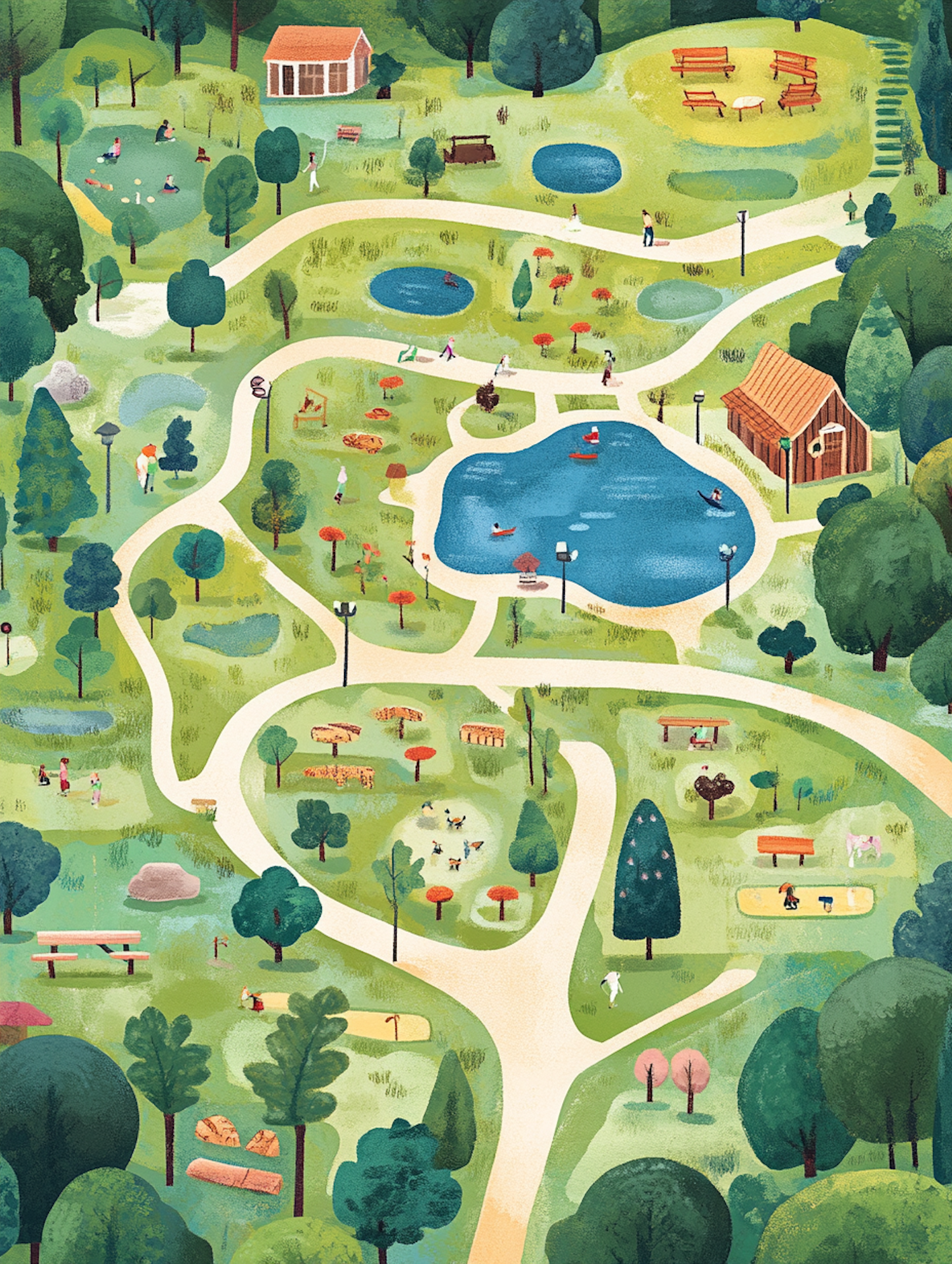 Charming park illustration with ponds, pathways, picnics, and playful activities surrounded by lush greenery and vibrant details.