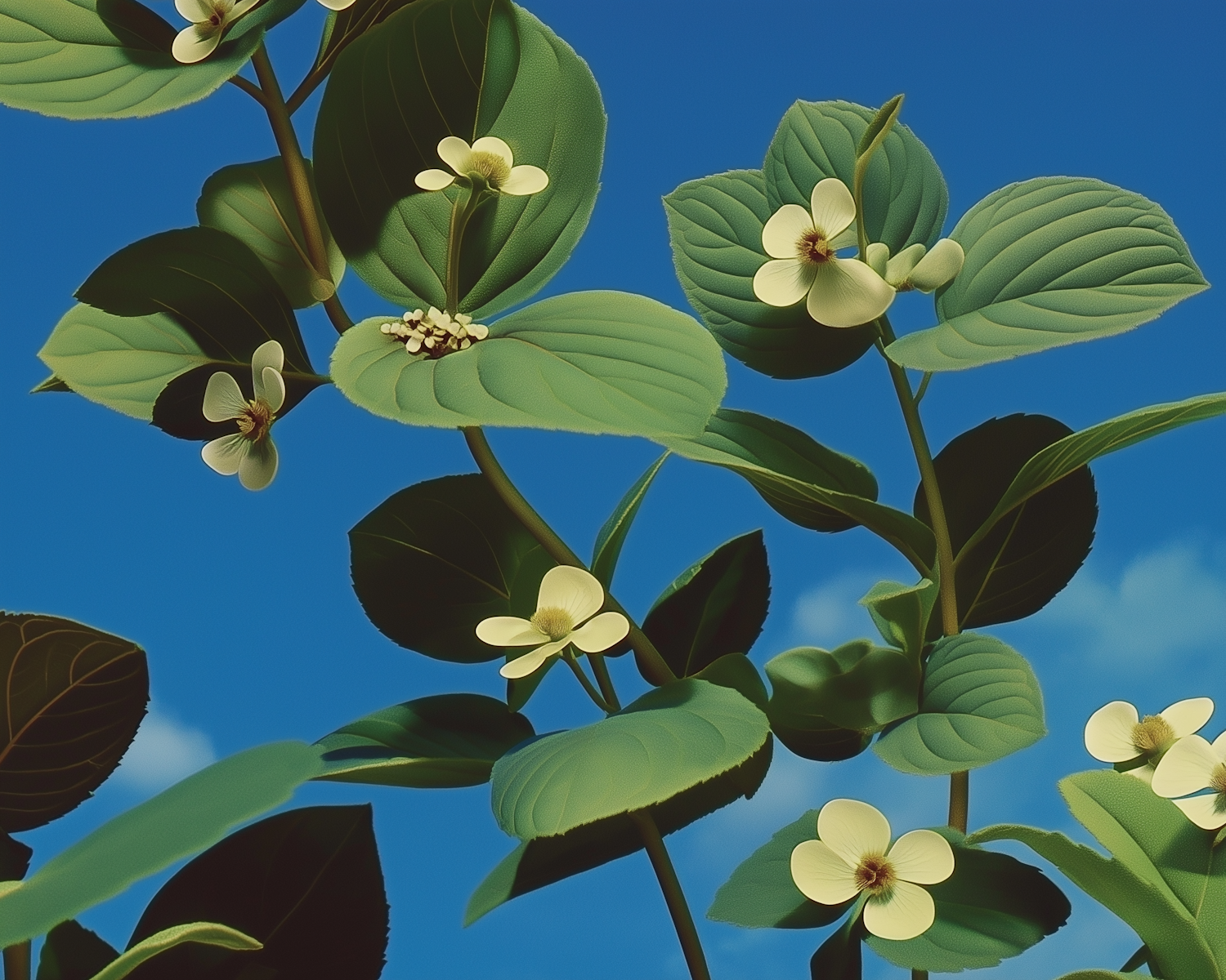 Illustration of a plant with green leaves and white flowers against a blue sky, showcasing nature's beauty and vitality.