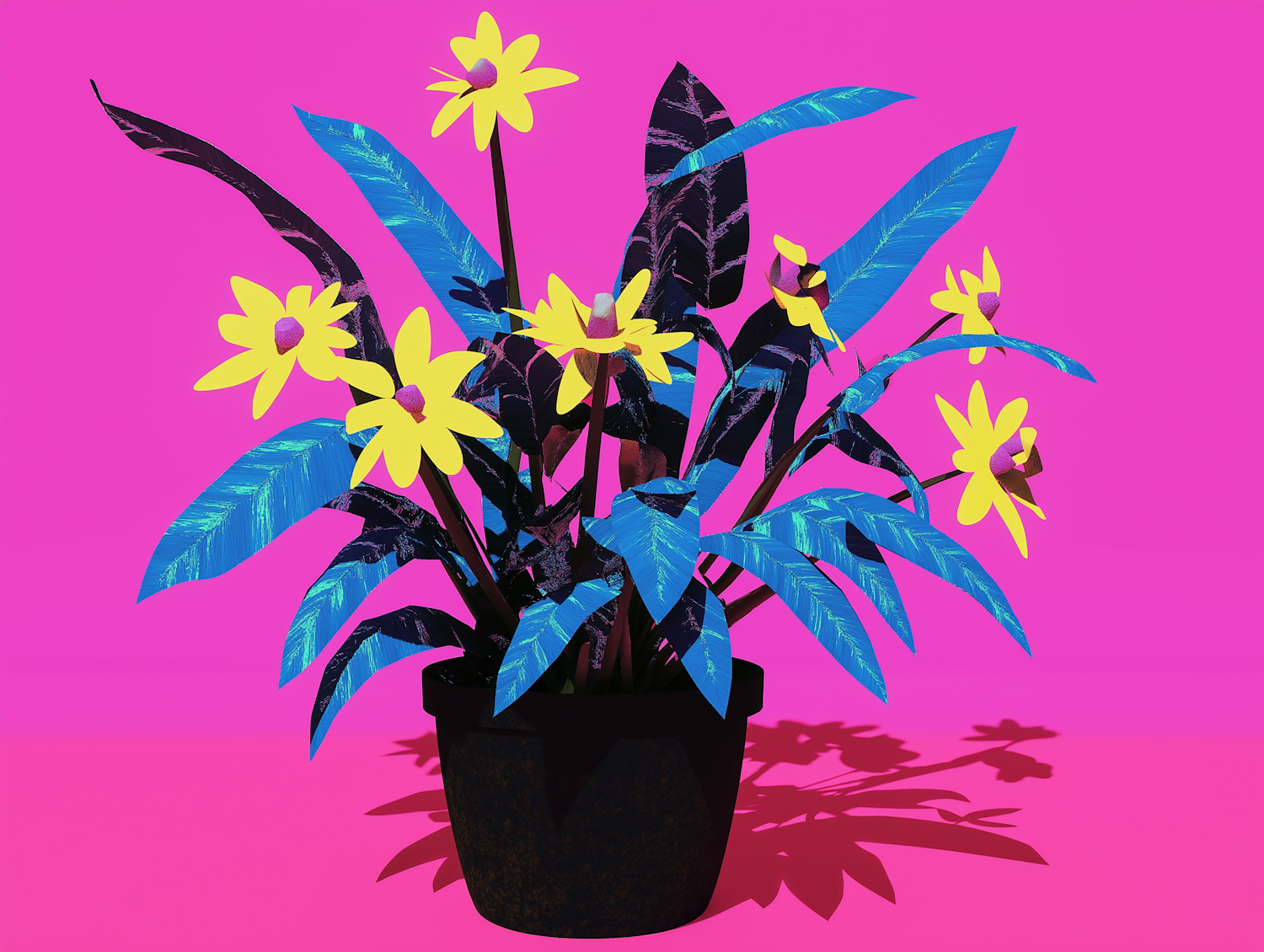 Vibrant illustration of a potted plant with blue leaves and yellow flowers against a bright pink background.