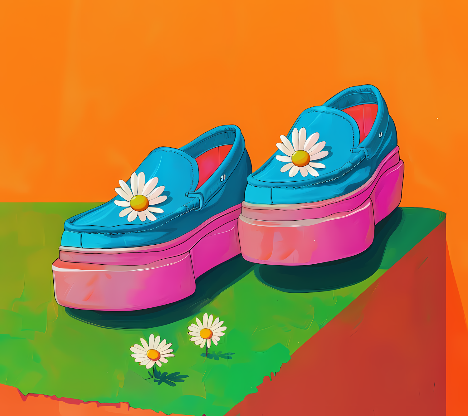 Vibrant blue platform shoes with daisies on a bold orange background, featuring pink soles and a green surface for a pop-art vibe.
