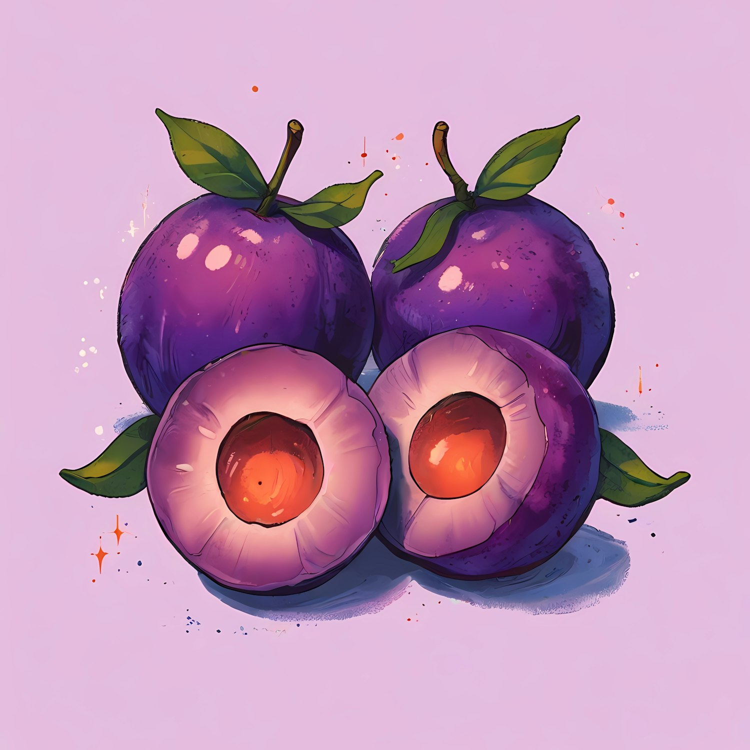 Illustration of three purple plums, two whole and one halved, with green leaves on a lavender background.