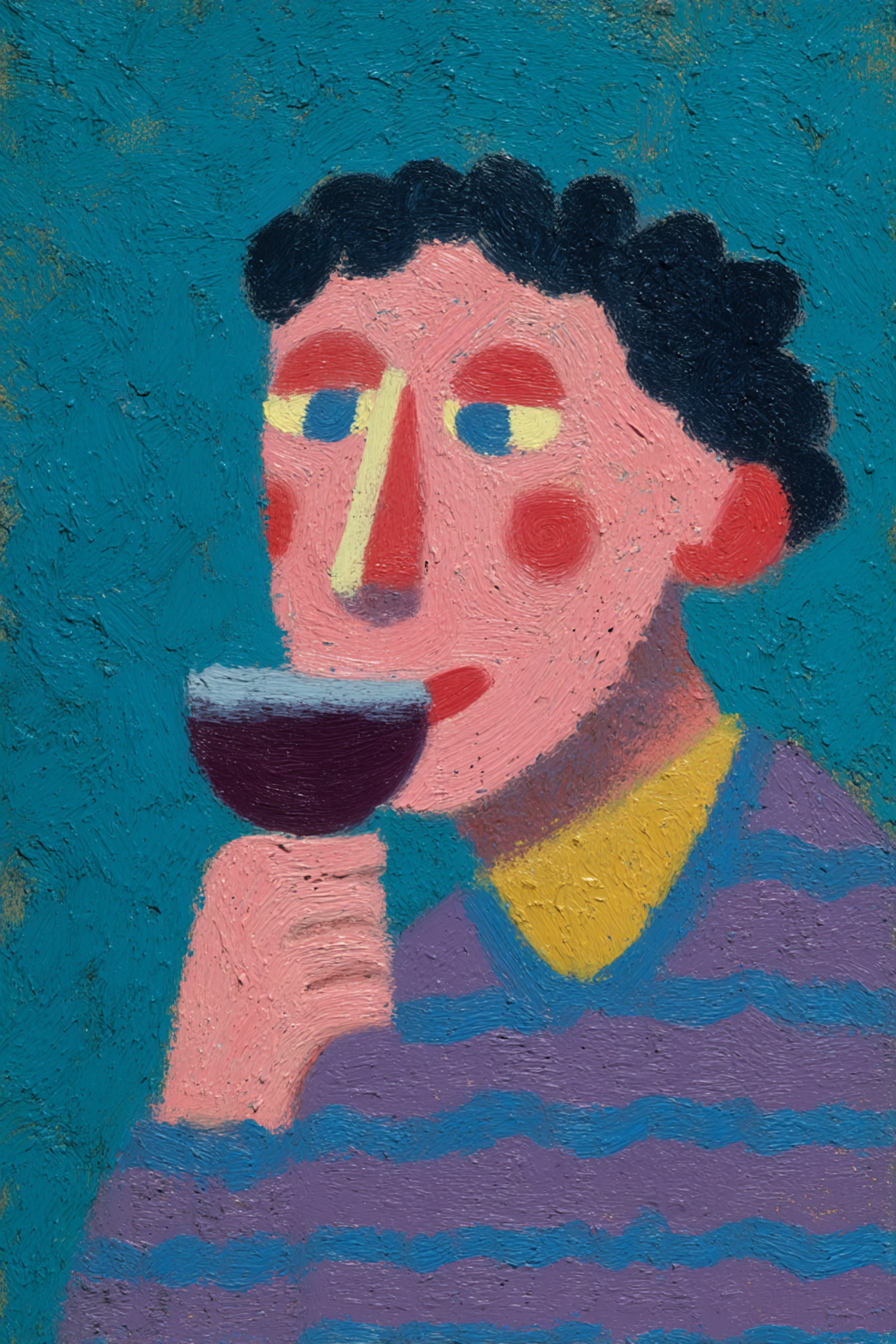 Textured expressionist artwork of a figure holding a glass of wine, standing against a vivid blue background in warm, bright tones.