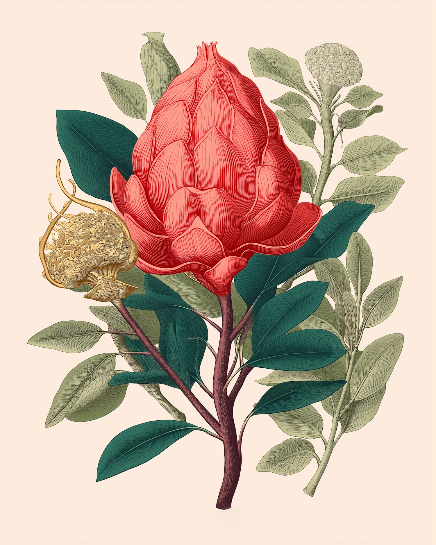 Detailed botanical illustration of a red protea flower with green leaves, golden-yellow accents, and a soft beige background.