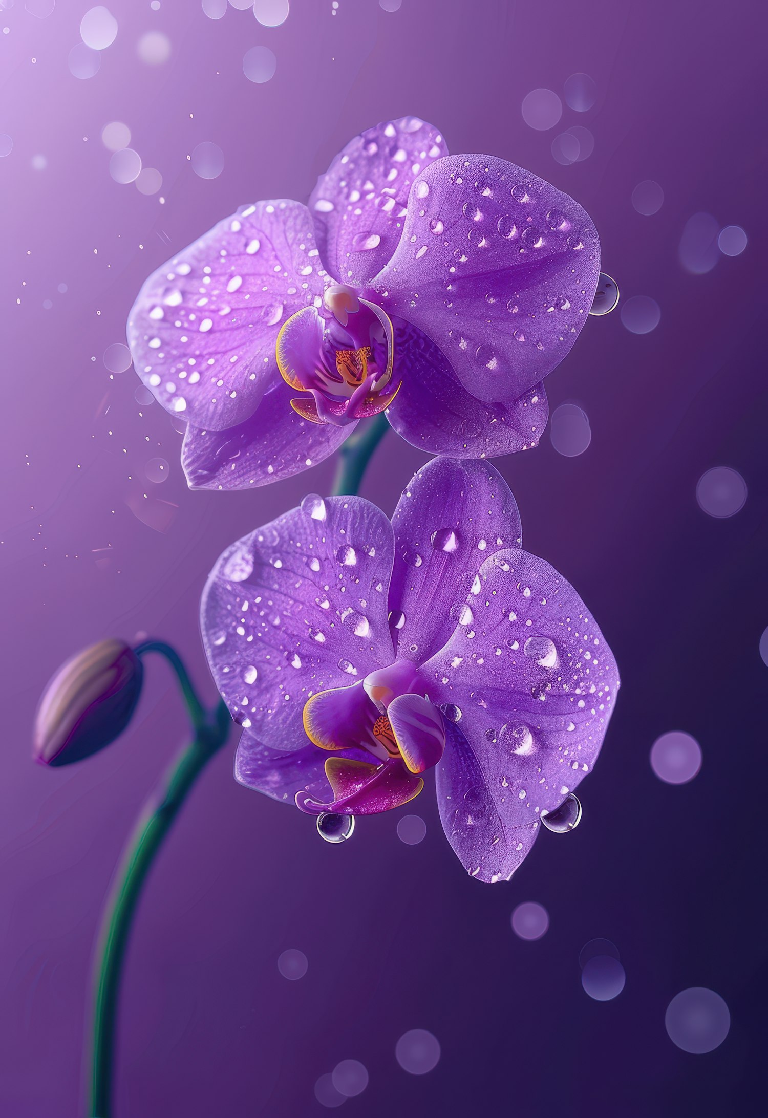 Close-up of purple orchids with water droplets on petals, set against a dreamy purple bokeh background. Elegant and fresh floral beauty.