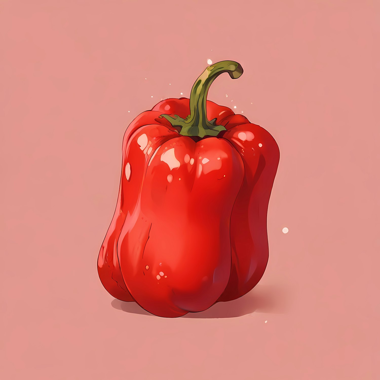 Illustration of a glossy red bell pepper with a green stem on a soft pink background, highlighting its vibrant color and freshness.