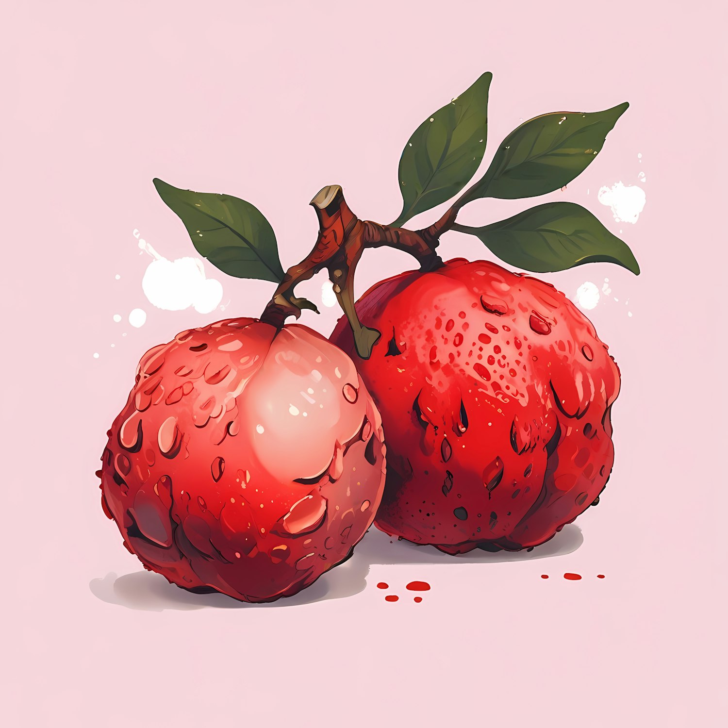 Detailed illustration of two fresh lychee fruits with water droplets, green leaves, and a soft pink background for a vibrant aesthetic.