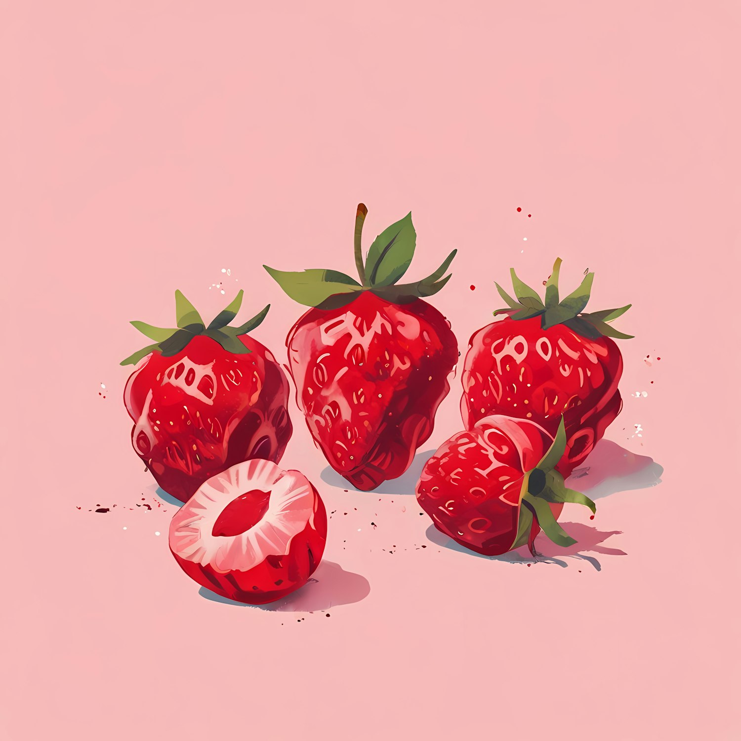 Vibrant illustration of fresh strawberries on a pink background, showcasing rich red hues and glossy textures.