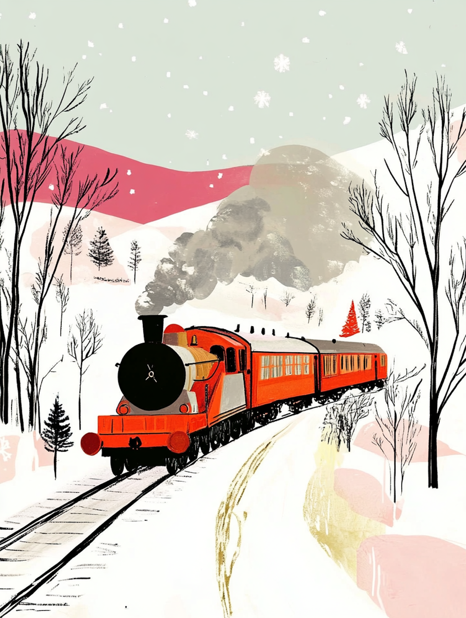Illustration of a red steam train traveling through a snowy landscape with falling snowflakes and bare trees.
