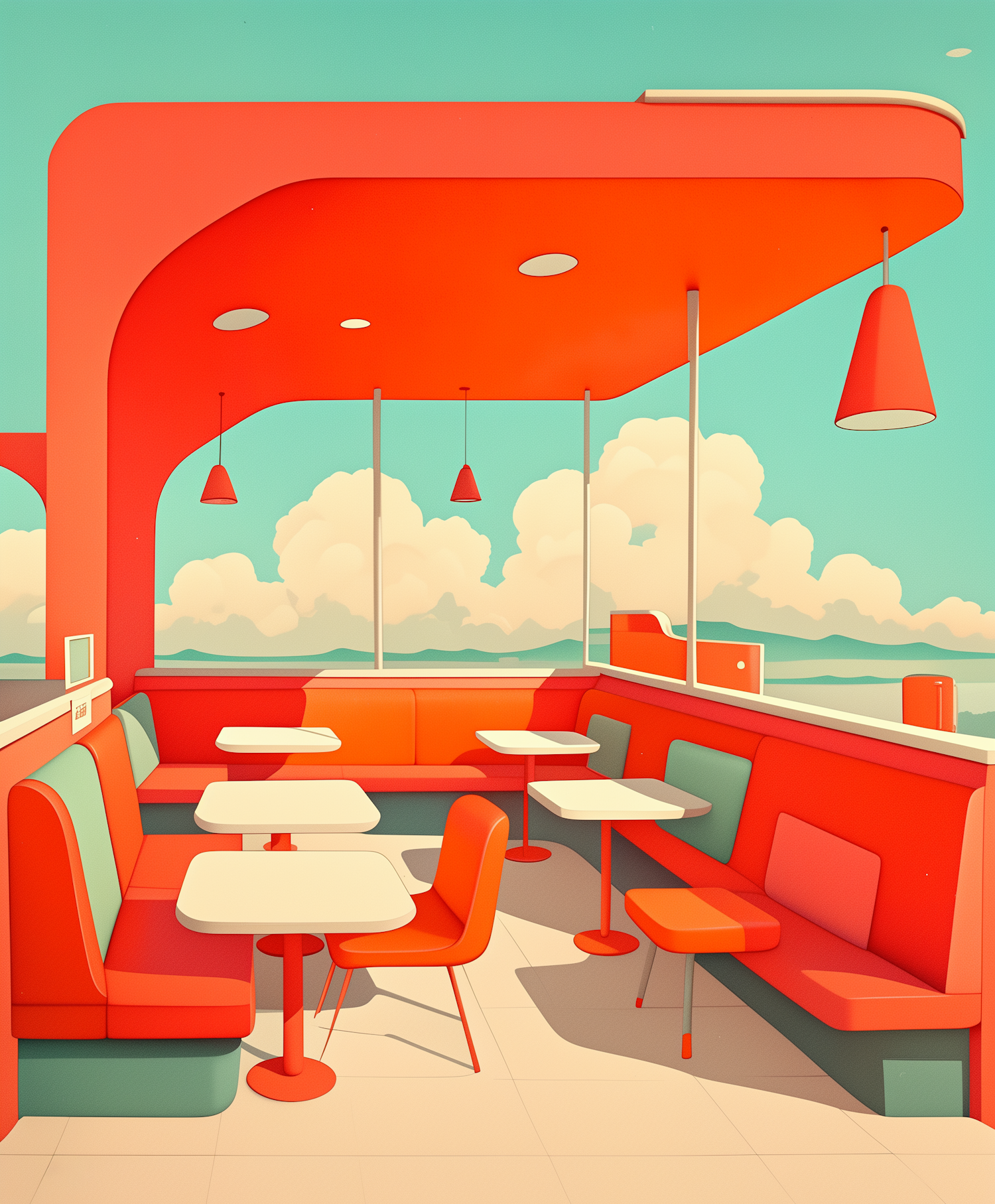Retro diner interior with bold red and teal colors, white tables, and pendant lights. Large windows reveal a serene sky view.