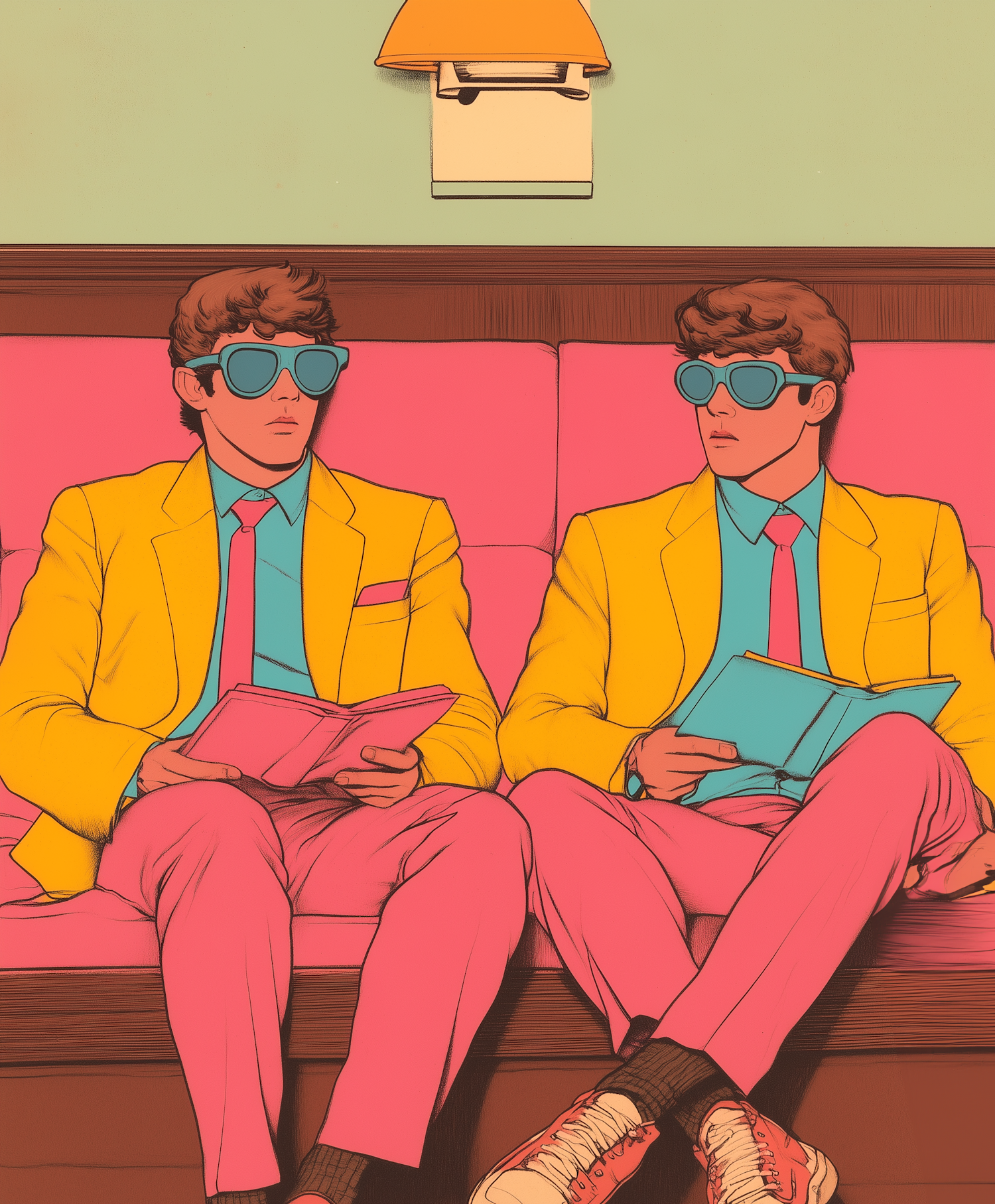 Two identical men in vibrant yellow suits and sunglasses sit on a pink couch, reading books. Retro and colorful illustration.