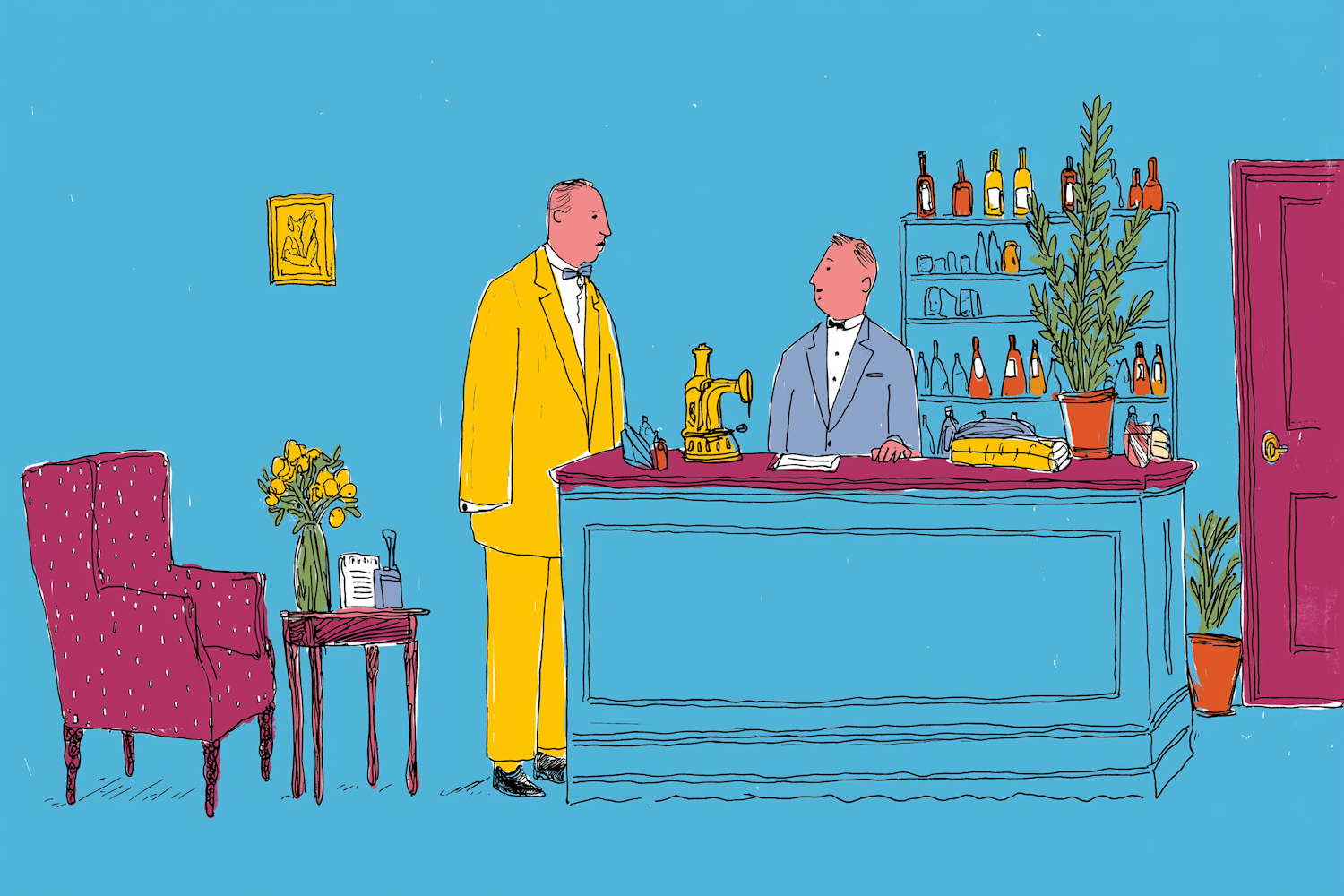 A colorful illustration of two men interacting at a counter in a vibrant room with plants, bottles, and a vintage aesthetic.