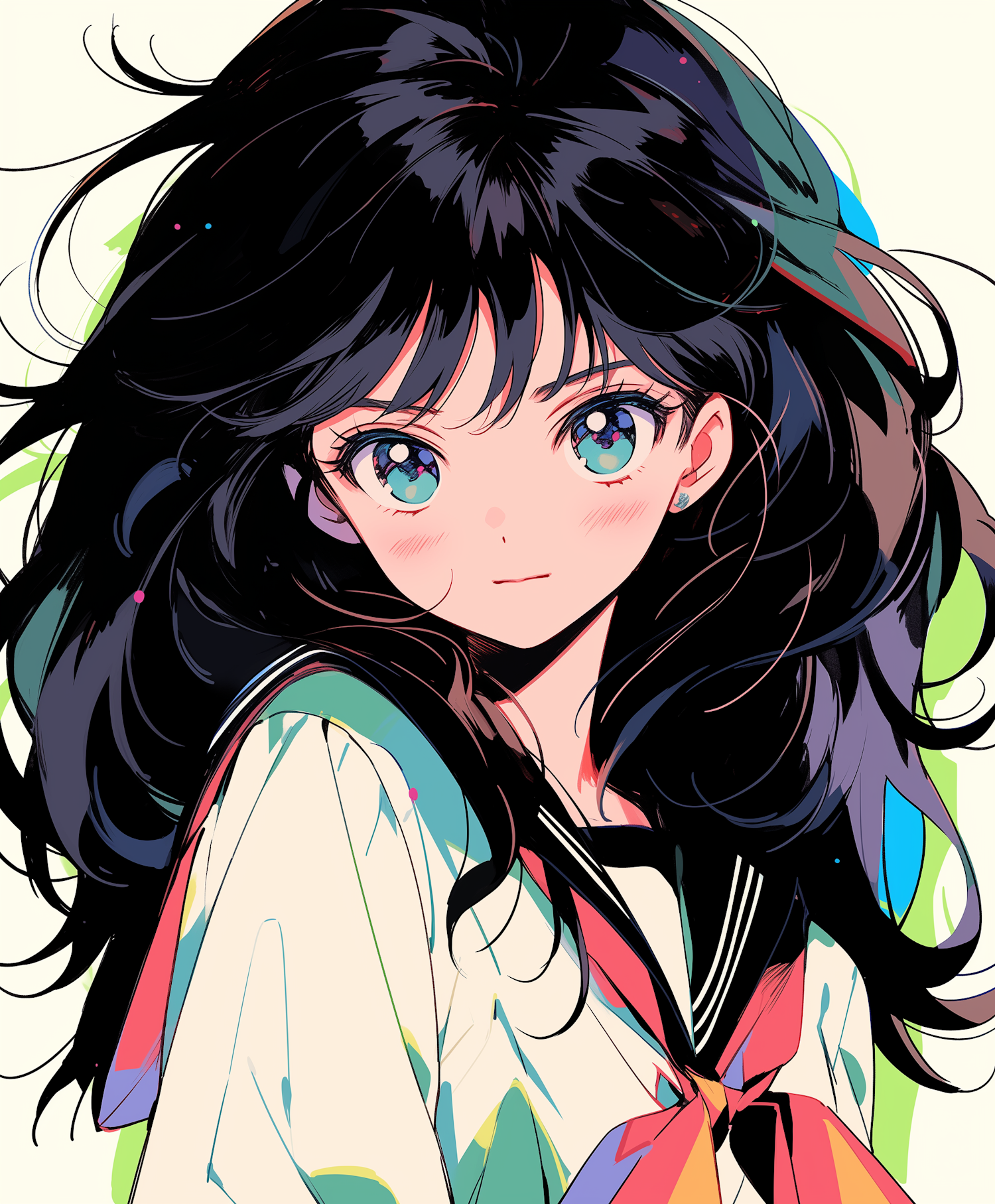 A colorful anime-style illustration of a young woman with flowing black hair, bright blue eyes, and a vibrant sailor-style outfit.