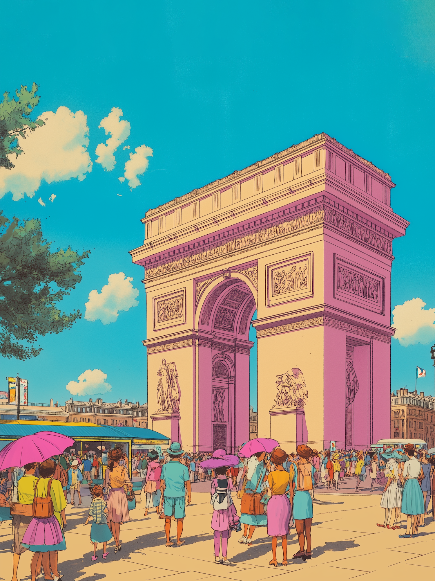 Colorful illustration of the Arc de Triomphe with vibrant pastel tones and lively crowd, capturing a bustling Parisian scene.