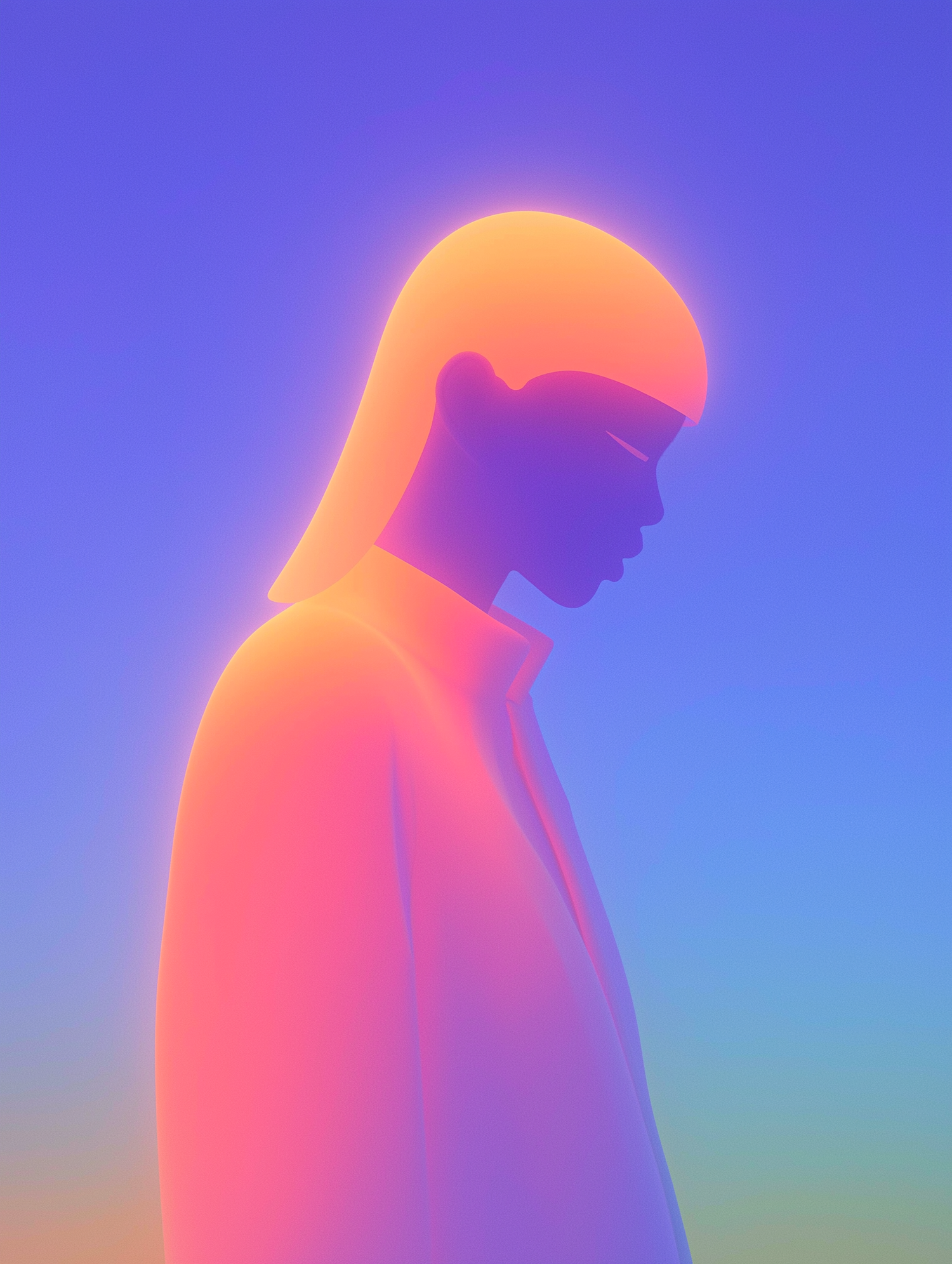 A vibrant illustration of a human figure in profile, glowing with warm orange and pink hues against a serene blue background.