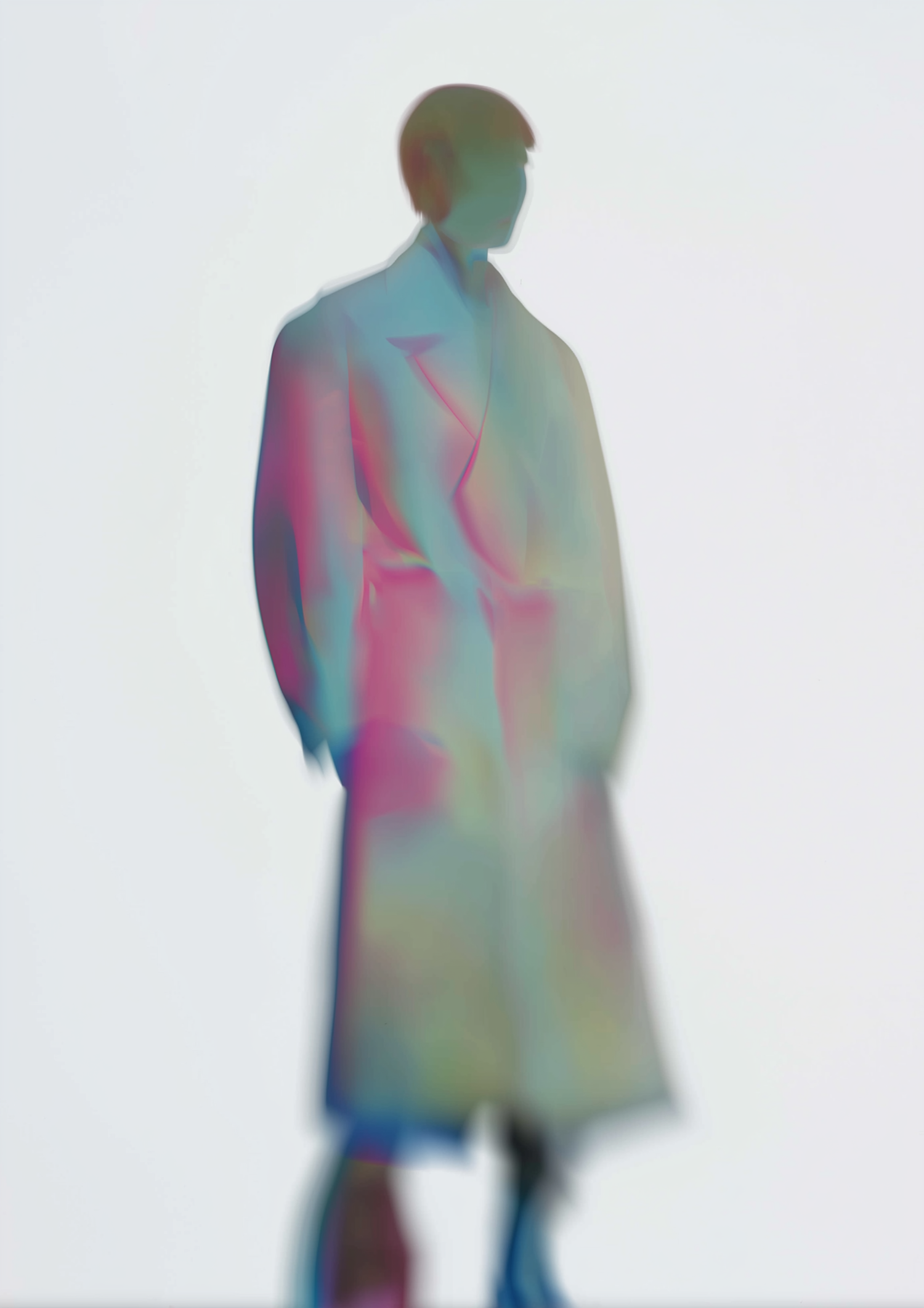 Abstract silhouette of a person in a colorful gradient coat on a white background, blending art and minimalism.