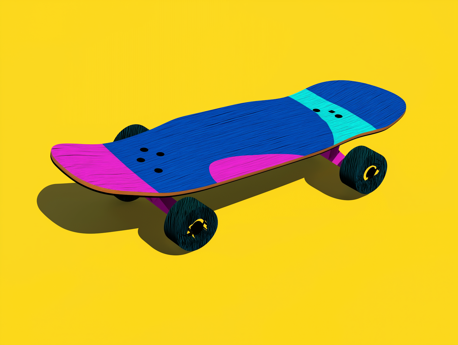 Colorful skateboard with geometric patterns on a bright yellow background, featuring blue, pink, and turquoise hues.