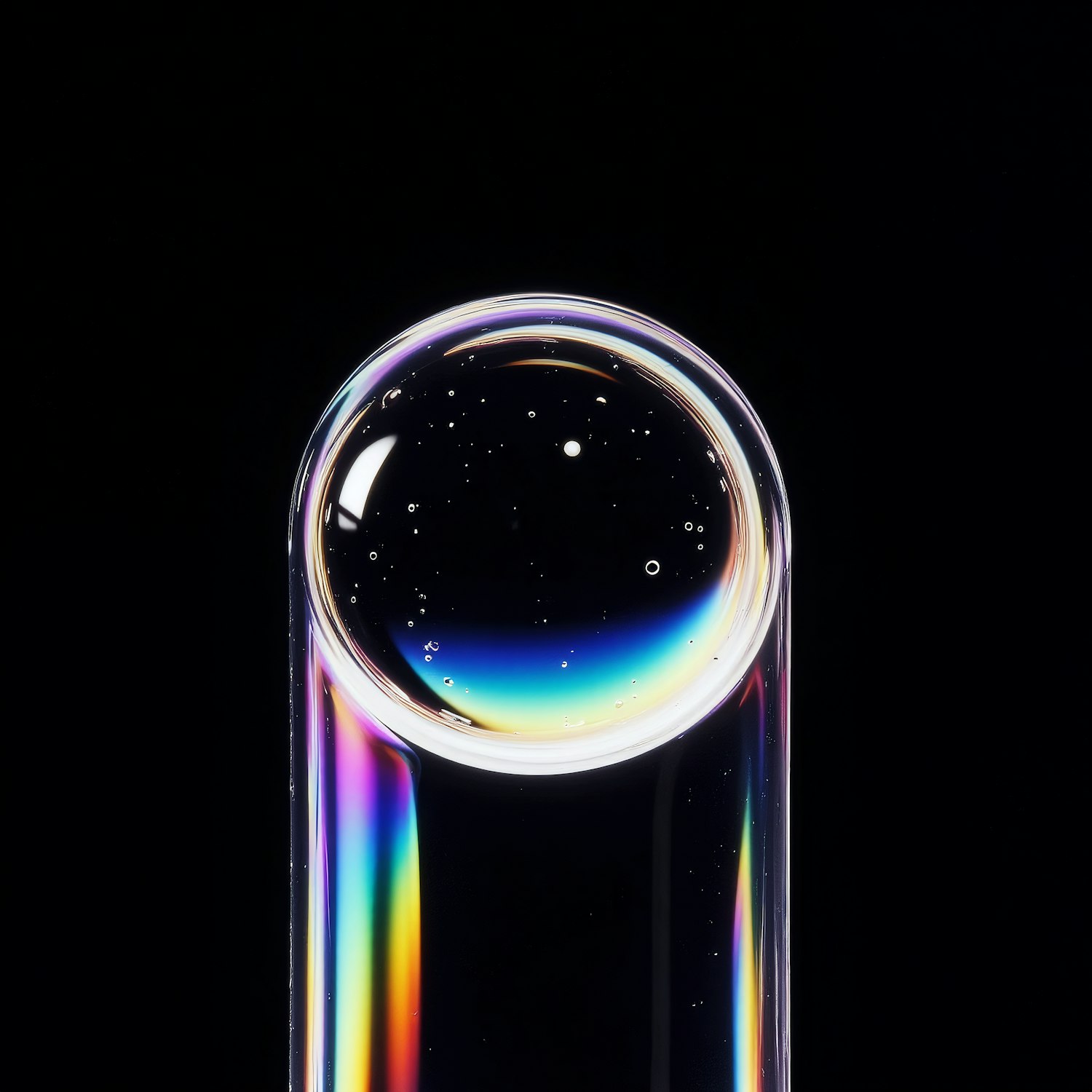 A vibrant soap bubble with a rainbow spectrum on a black background, showcasing its delicate and colorful surface.