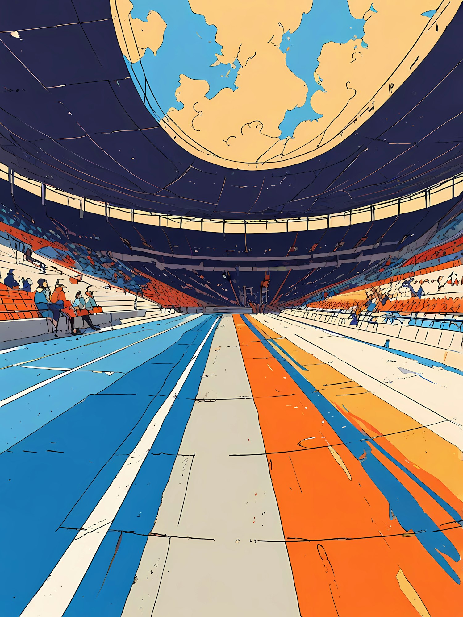 Colorful stadium illustration with bold blue and orange track, lively spectators, and a sunny sky. Dynamic perspective from ground level.