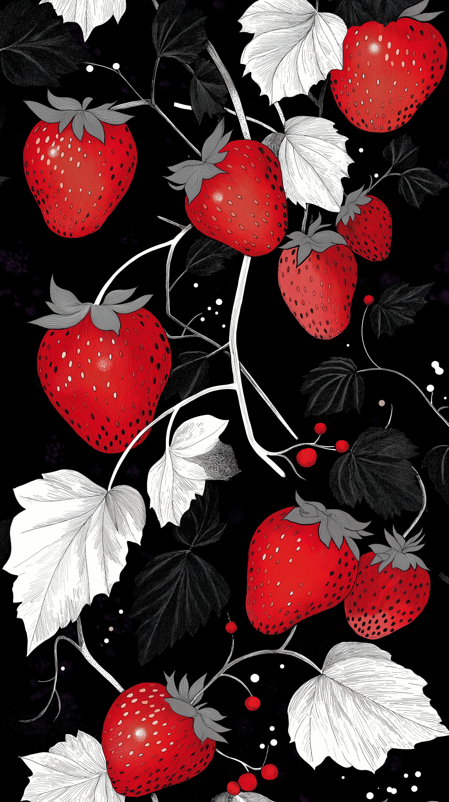 Vibrant red strawberries with detailed leaves on a black background, creating a striking and dramatic illustration.