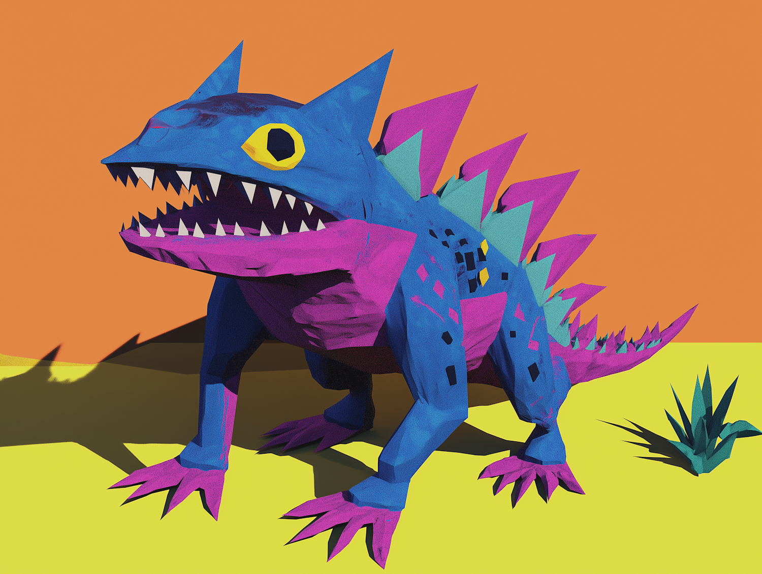 Colorful, stylized creature with blue body, purple spikes, and yellow eyes on an orange background. Bold and imaginative design.