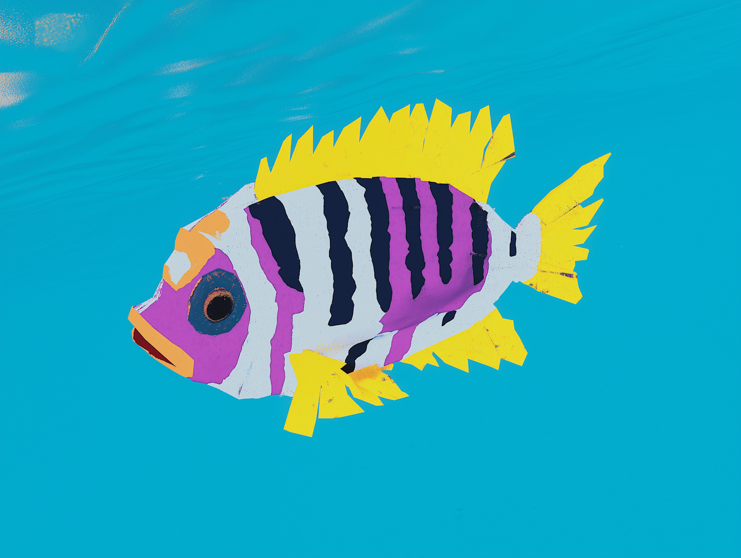 Colorful fish illustration with purple, yellow, and black stripes on a bright blue background. Vibrant and artistic design.