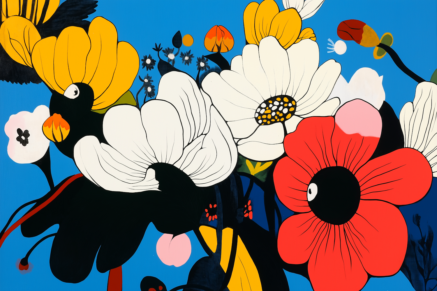 Vibrant illustration of stylized flowers in bold colors against a bright blue background, featuring red, yellow, and white blooms.