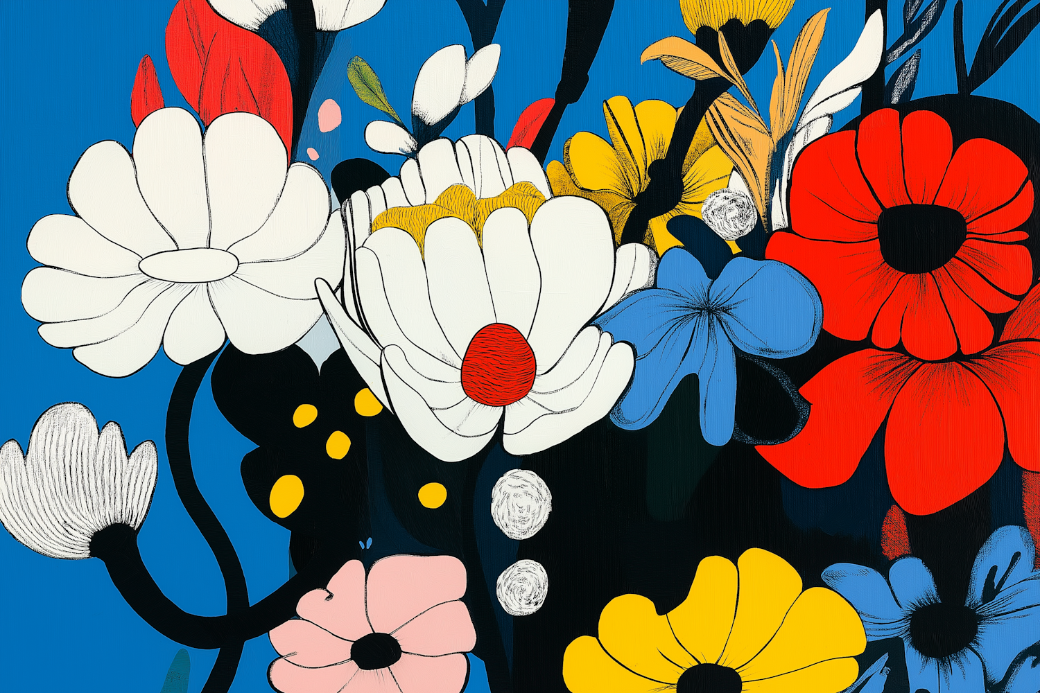 Colorful floral illustration with bold red, white, yellow, and blue flowers on a deep blue background.