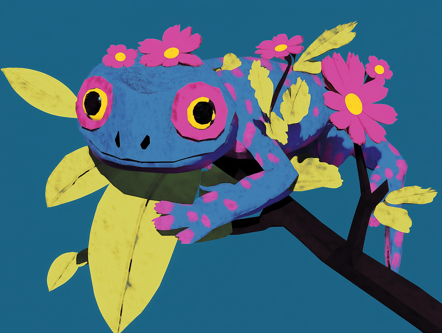 Colorful illustration of a blue frog with pink spots and flowers, perched on a branch with yellow leaves against a teal background.