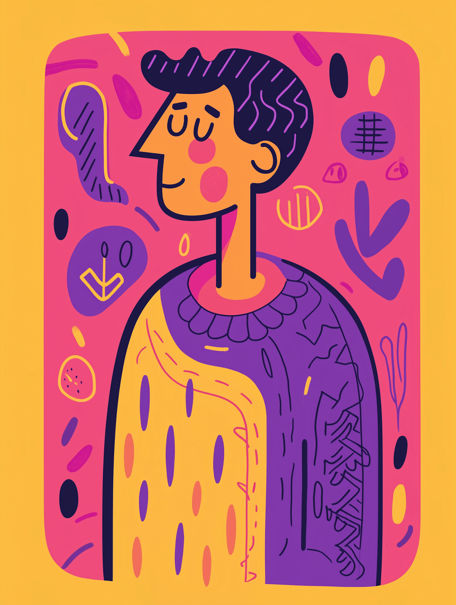 Colorful abstract illustration of a stylized character with wavy hair, set against a vibrant pink and purple background.