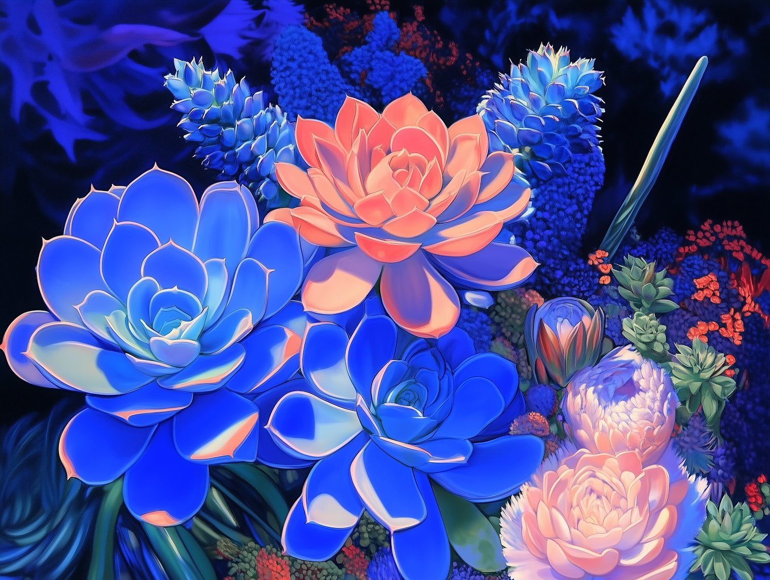Vibrant illustration of surreal succulents in electric blue and peach hues, set against a deep blue background.