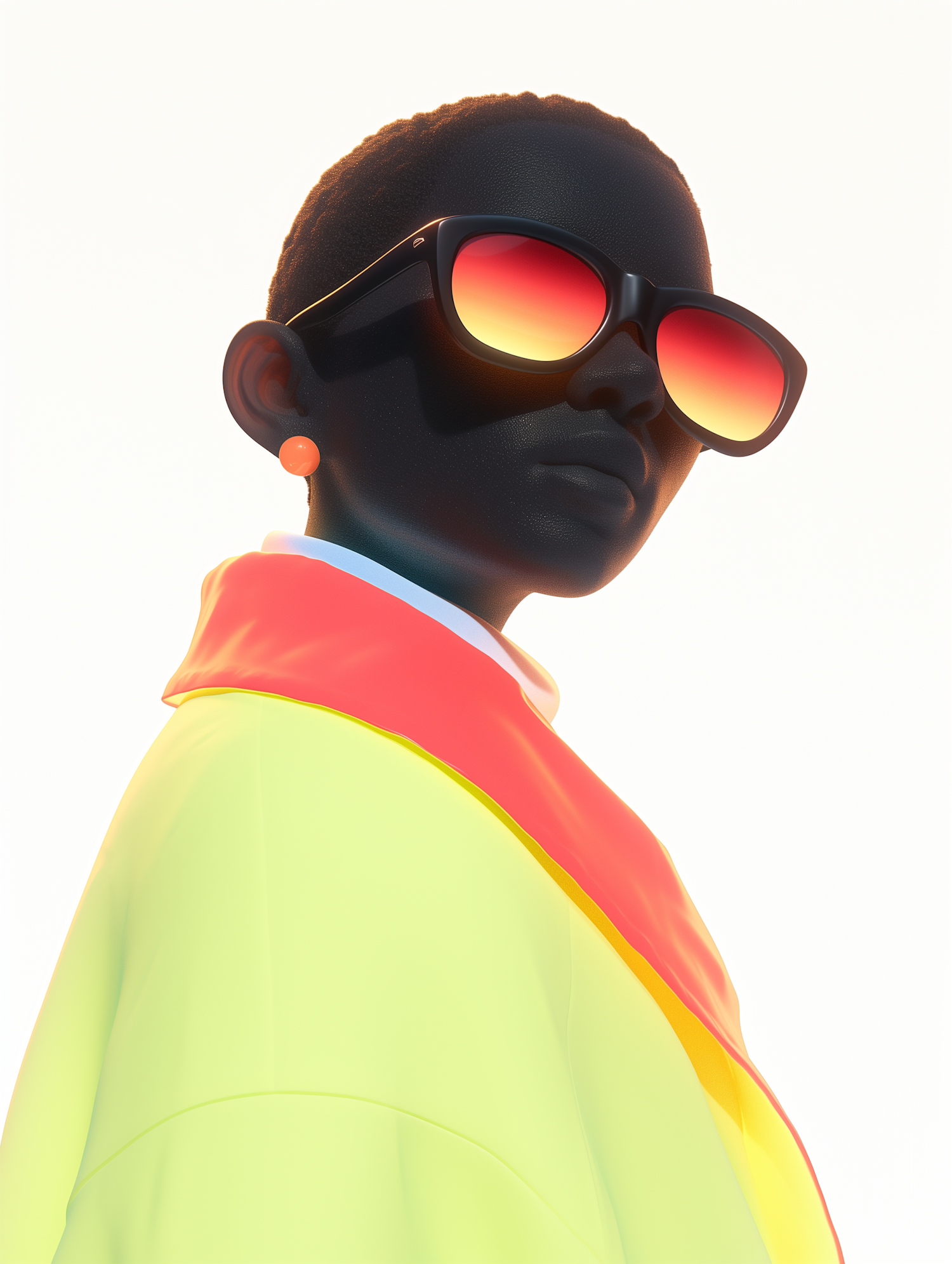 A bold portrait of a person in vibrant neon attire and gradient sunglasses, set against a bright background for a modern aesthetic.