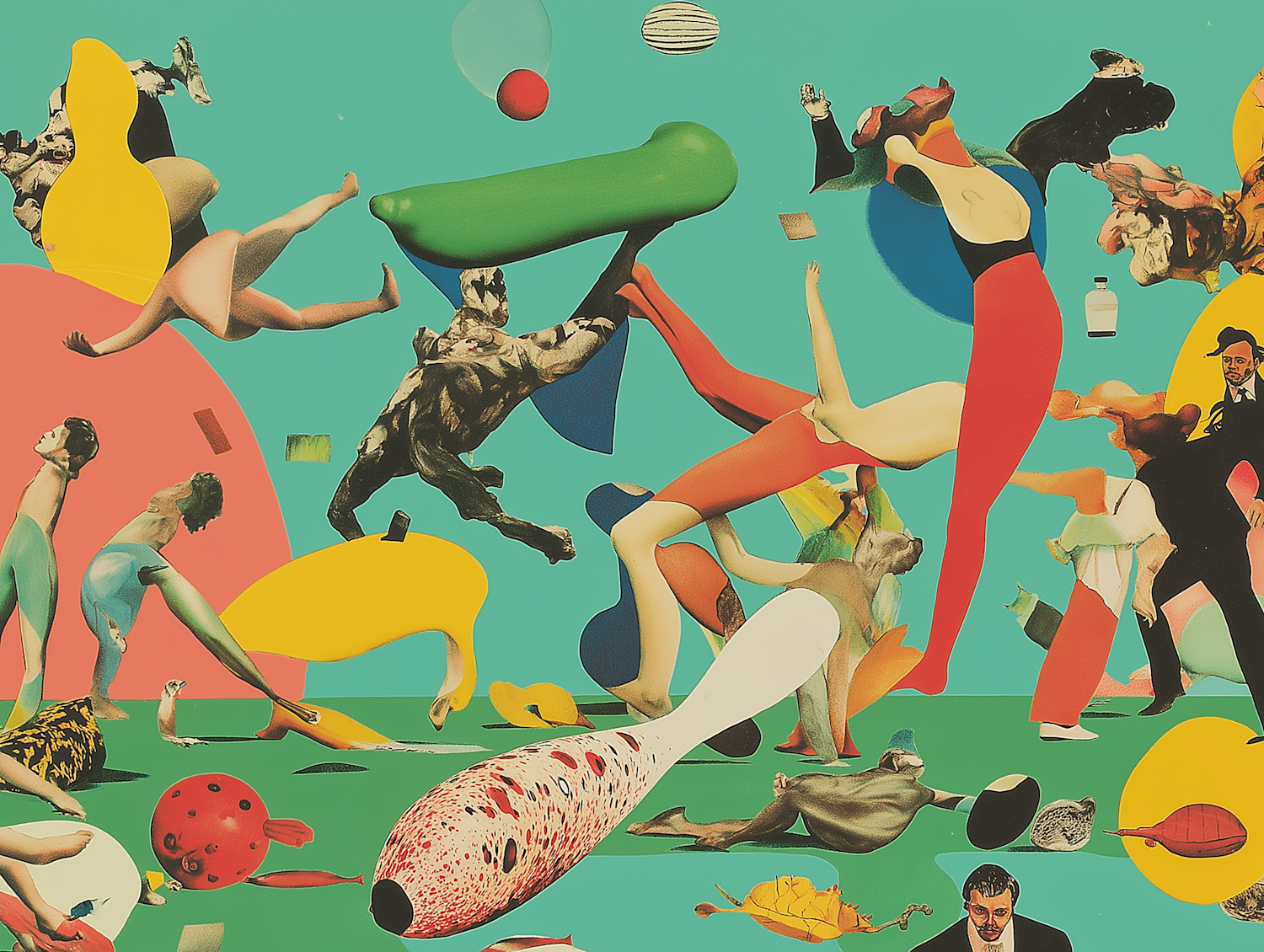 Surreal collage with dynamic human and animal forms intertwined with abstract shapes on a vibrant turquoise background.