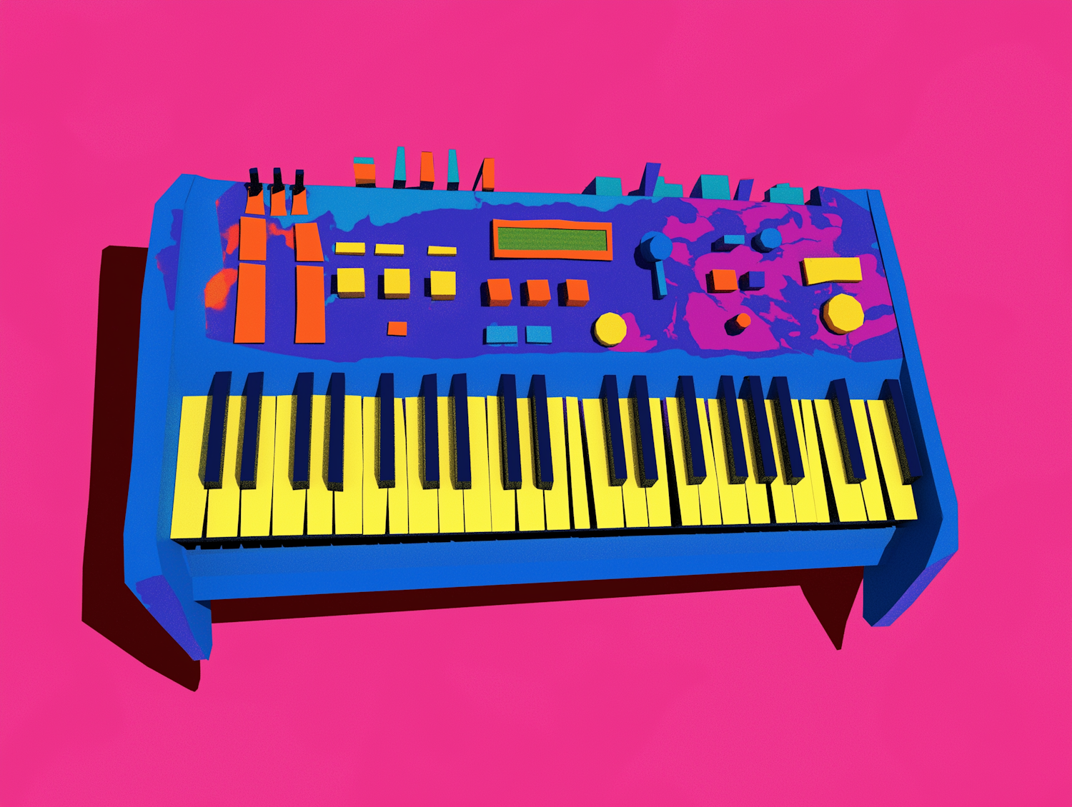 Colorful pop-art style illustration of a synthesizer keyboard with vibrant blue, yellow, and orange on a pink background.