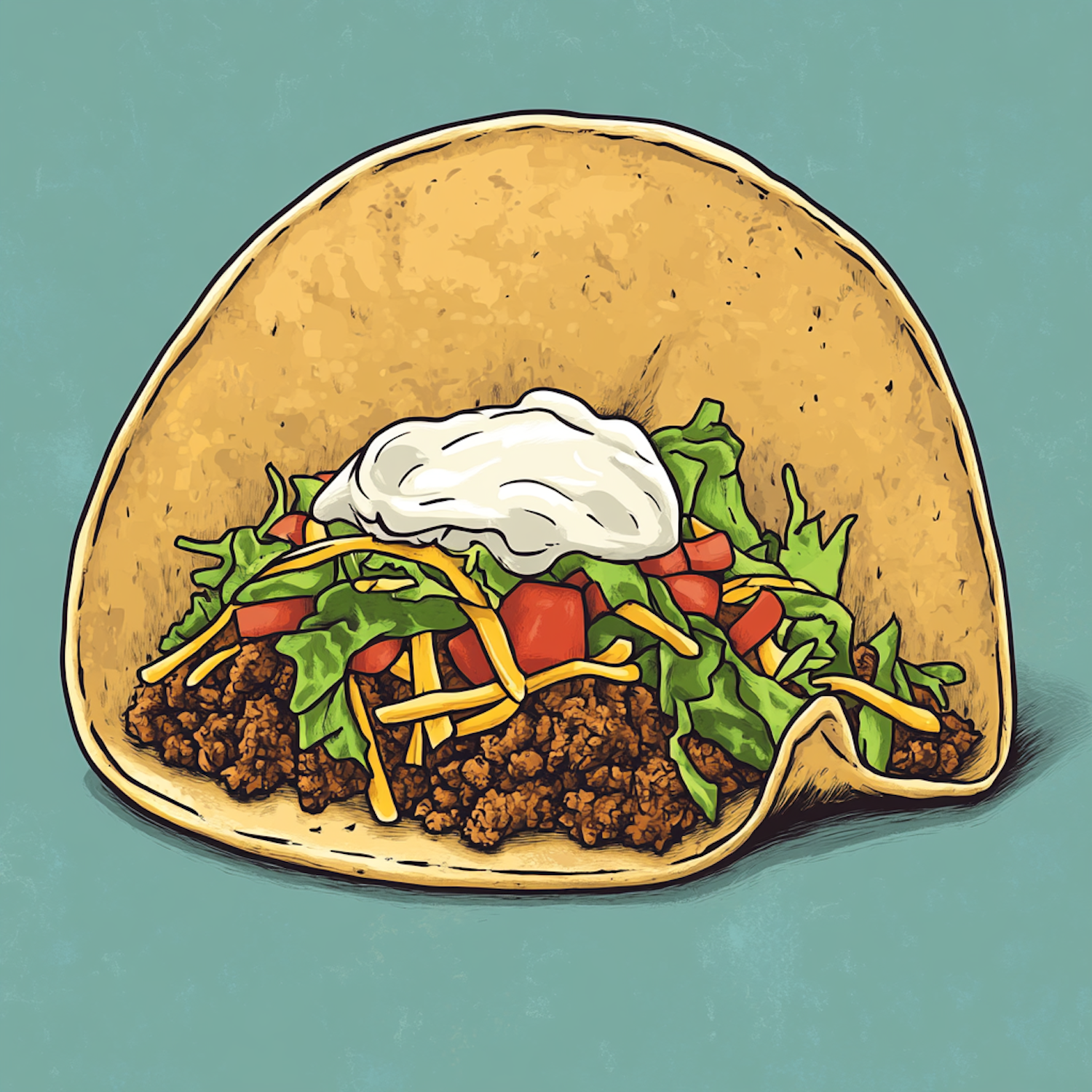 Colorful illustration of a taco with beef, lettuce, tomatoes, cheese, and sour cream on a teal background.