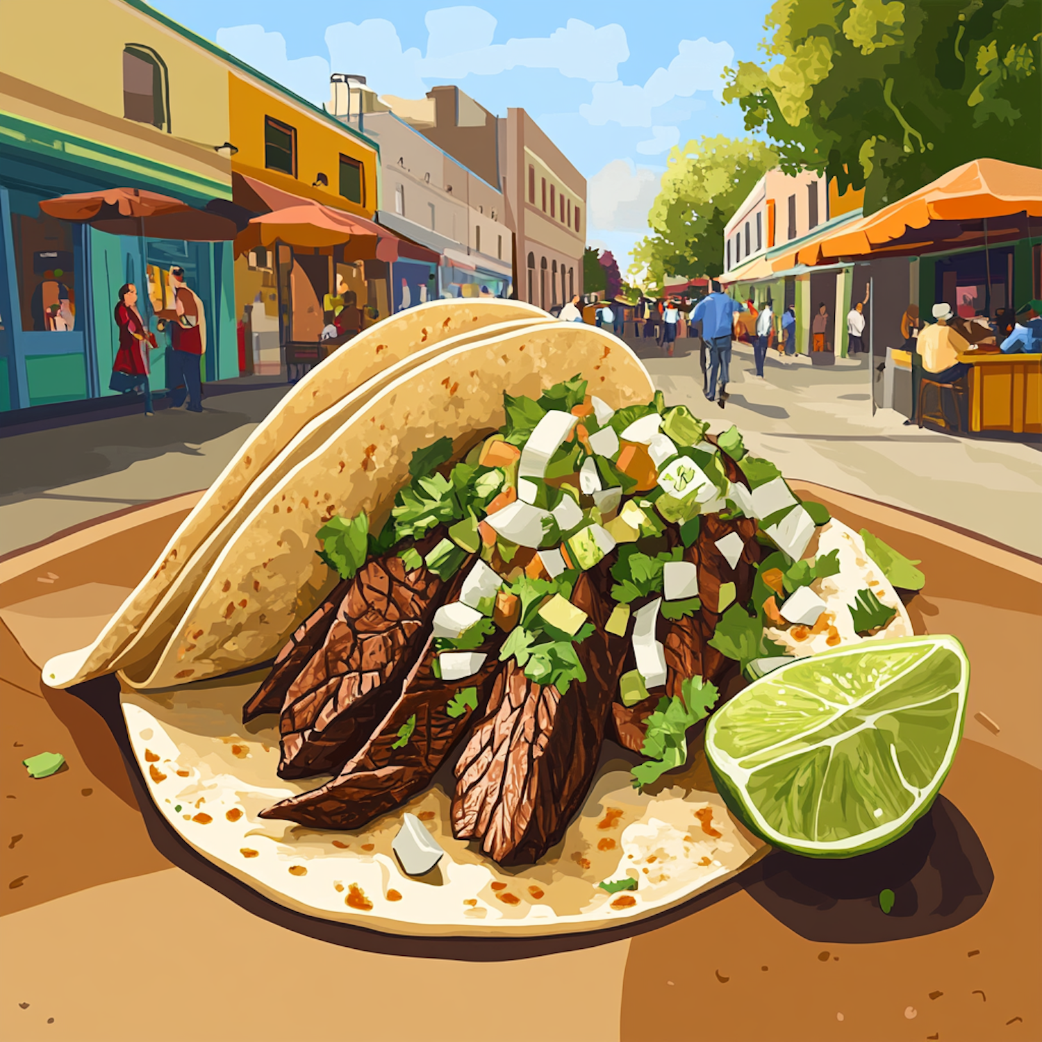 Illustration of a delicious taco with grilled meat, cilantro, and lime in a lively street market scene.