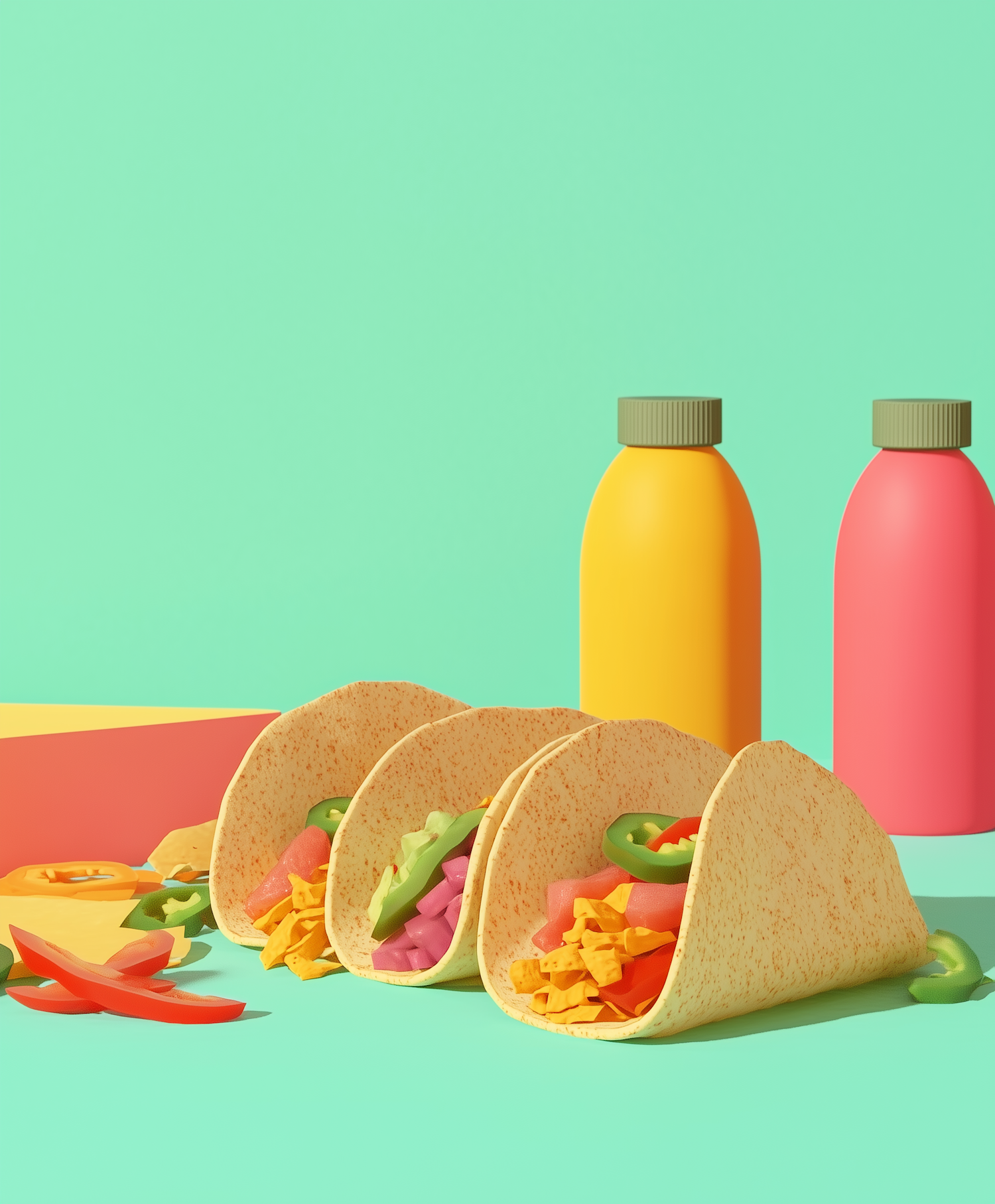 Colorful 3D tacos with vibrant ingredients and bottles on a turquoise background, creating a playful and modern food scene.