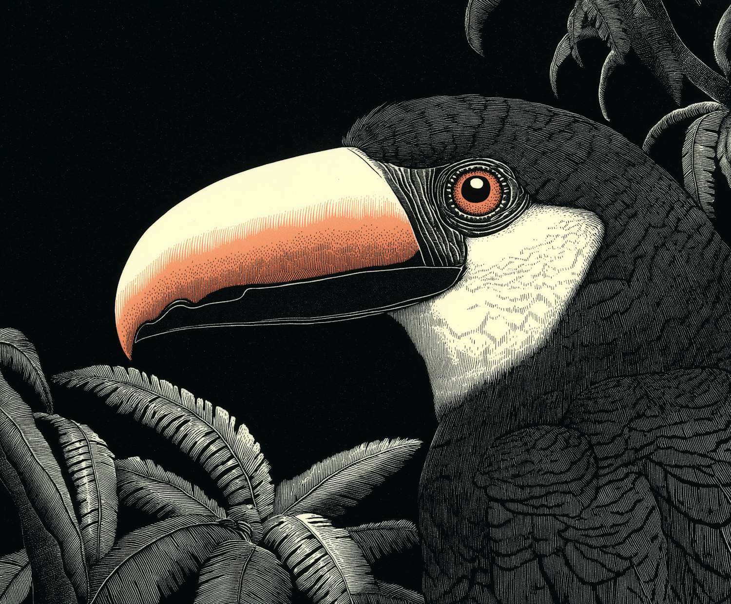 Intricate illustration of a toucan with a vibrant beak and eye, surrounded by tropical foliage. Detailed lines and shading create depth.