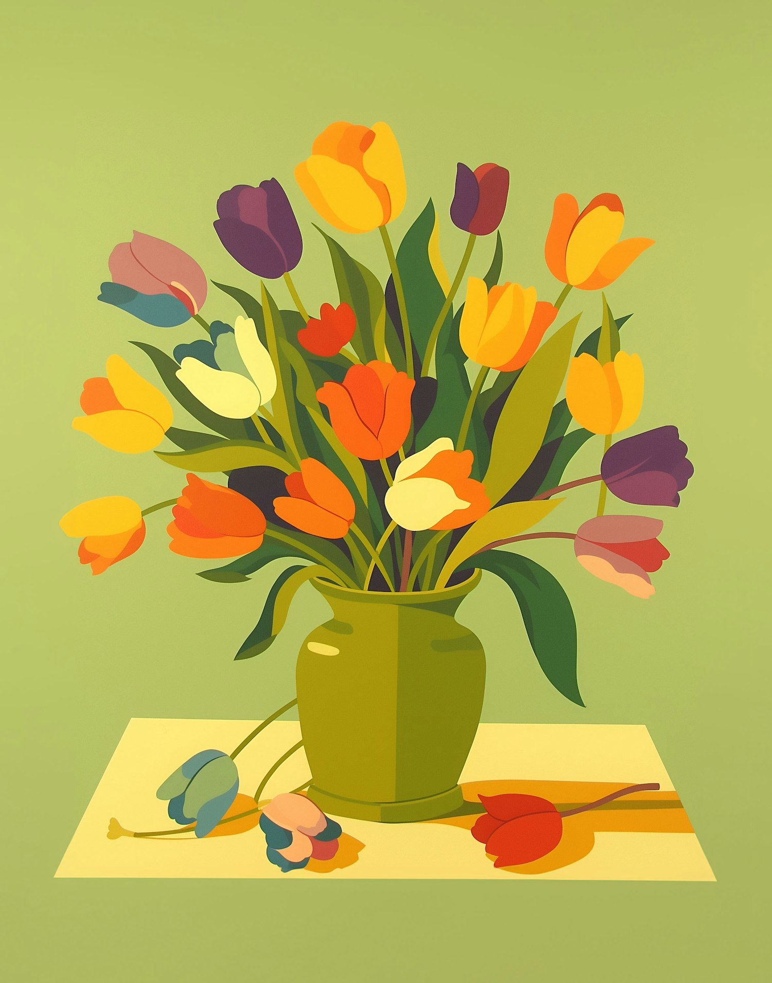Colorful tulip bouquet in a green vase on a light surface, with a soft green background. Bold, graphic illustration style.