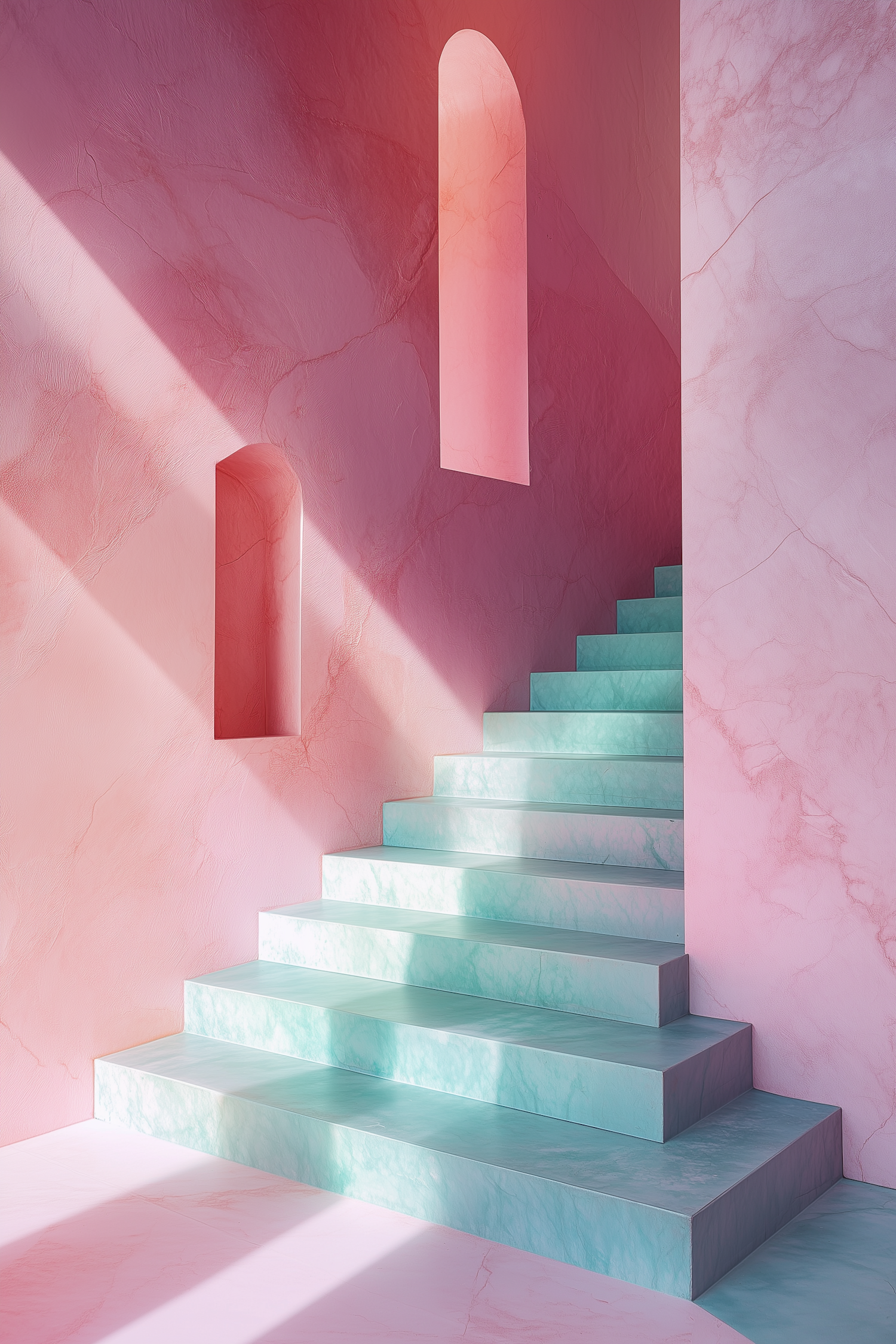 Surreal staircase with turquoise steps and pink walls, bathed in sunlight. A dreamy, minimalist architectural scene.