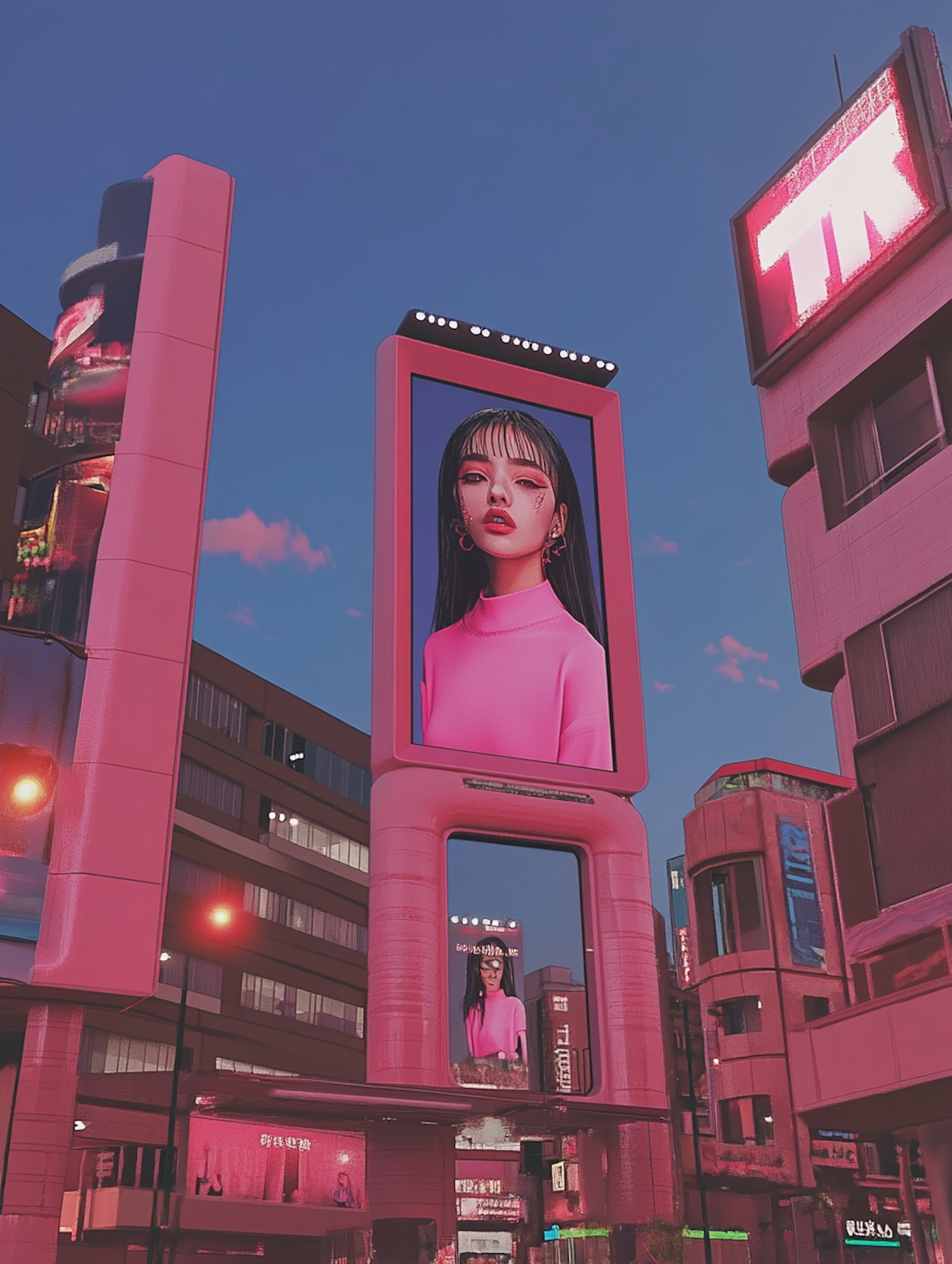Futuristic cityscape with neon billboards featuring a woman in pink, set against a vibrant dusk sky.