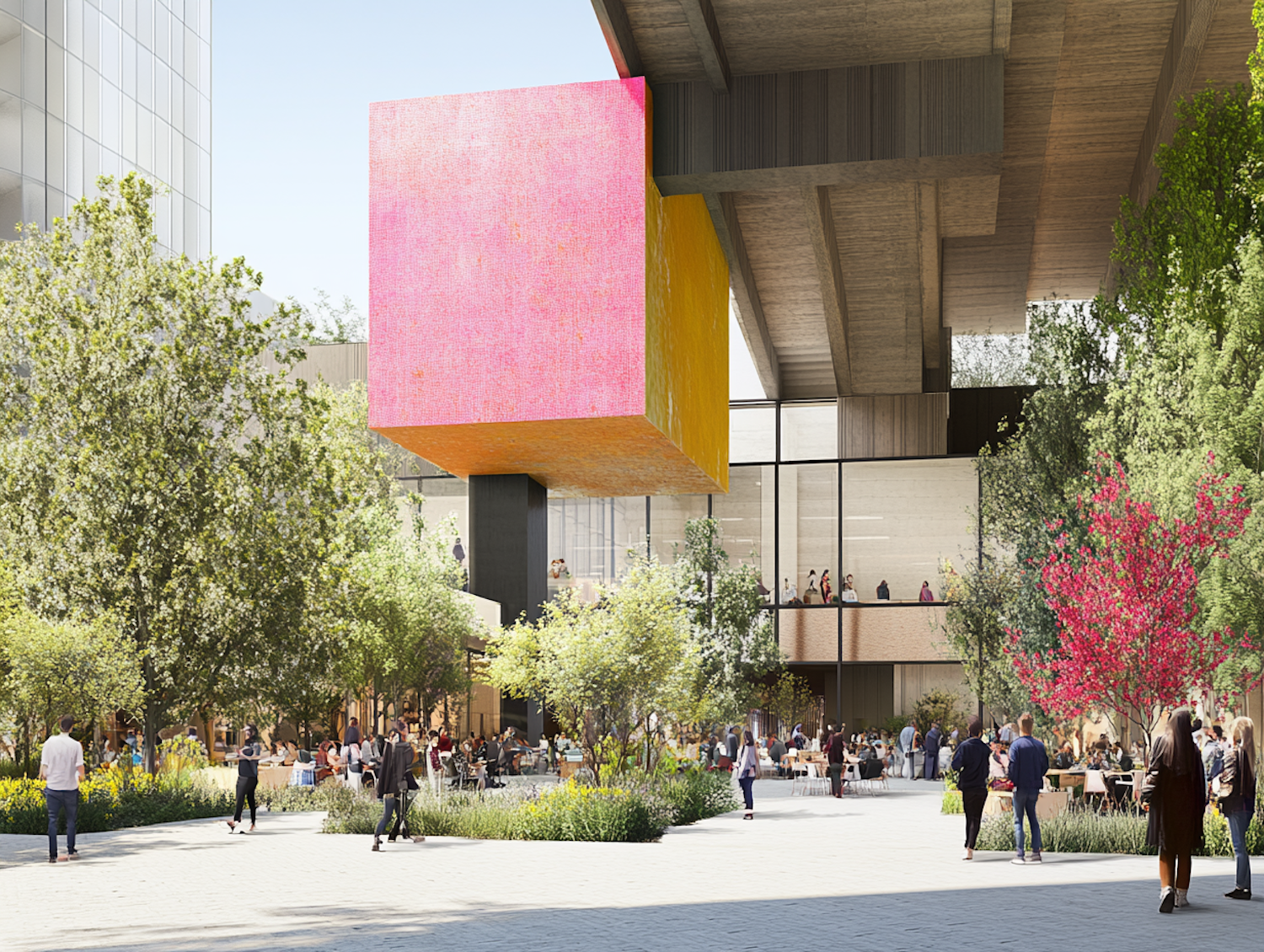Vibrant urban courtyard with a colorful cube structure, lively crowd, and lush greenery, blending modern architecture with nature.