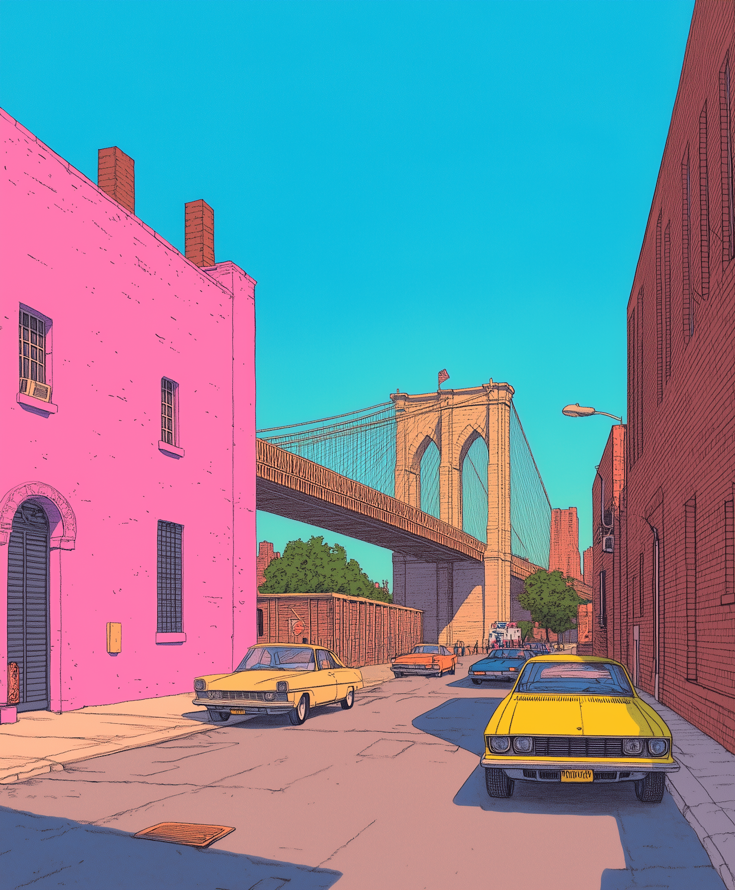 Colorful city street illustration with vintage cars and Brooklyn Bridge. Bright pink and red buildings under a clear blue sky.