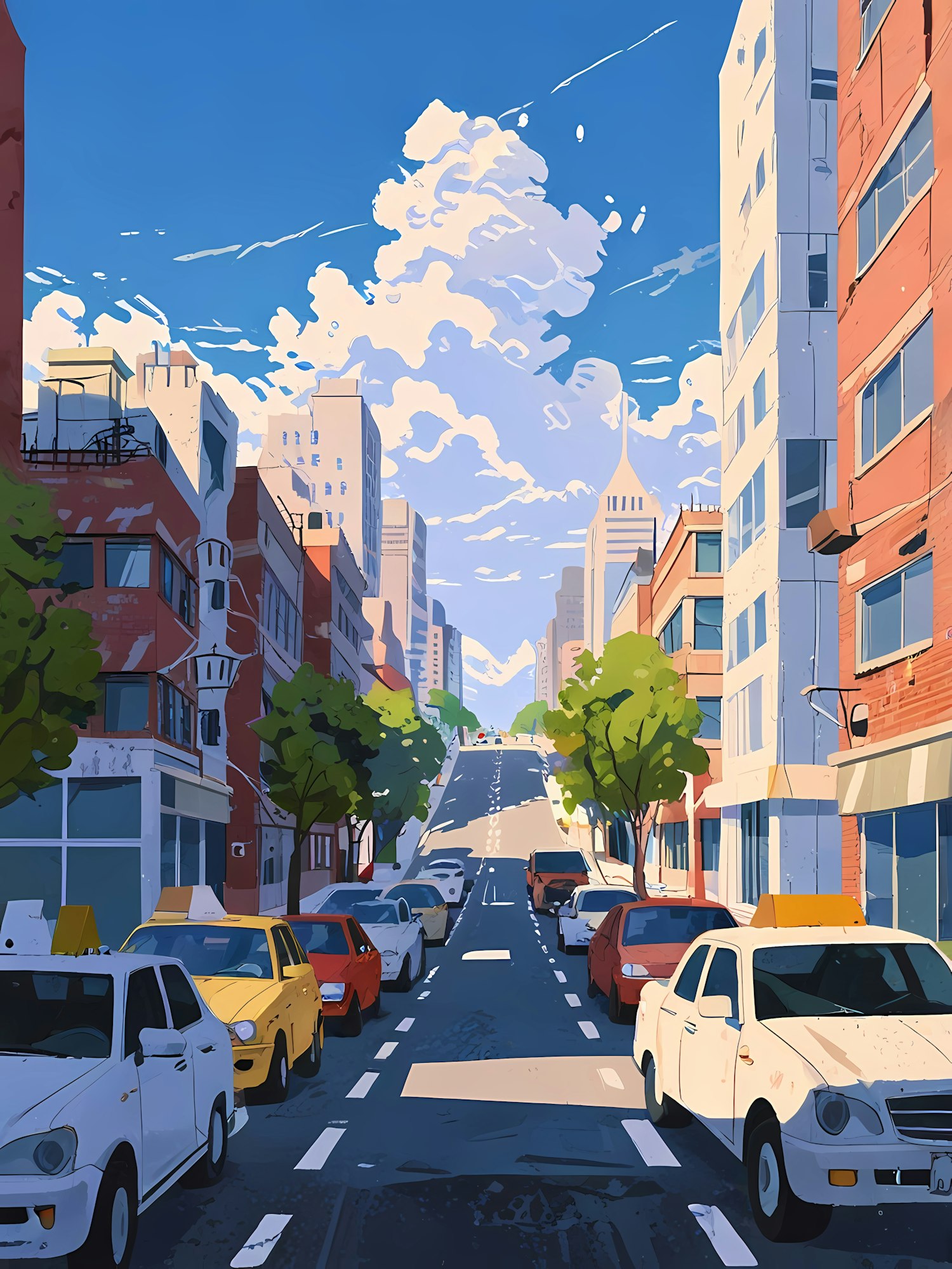 Vibrant city street with parked cars, tall buildings, and lush trees under a clear blue sky with fluffy clouds.