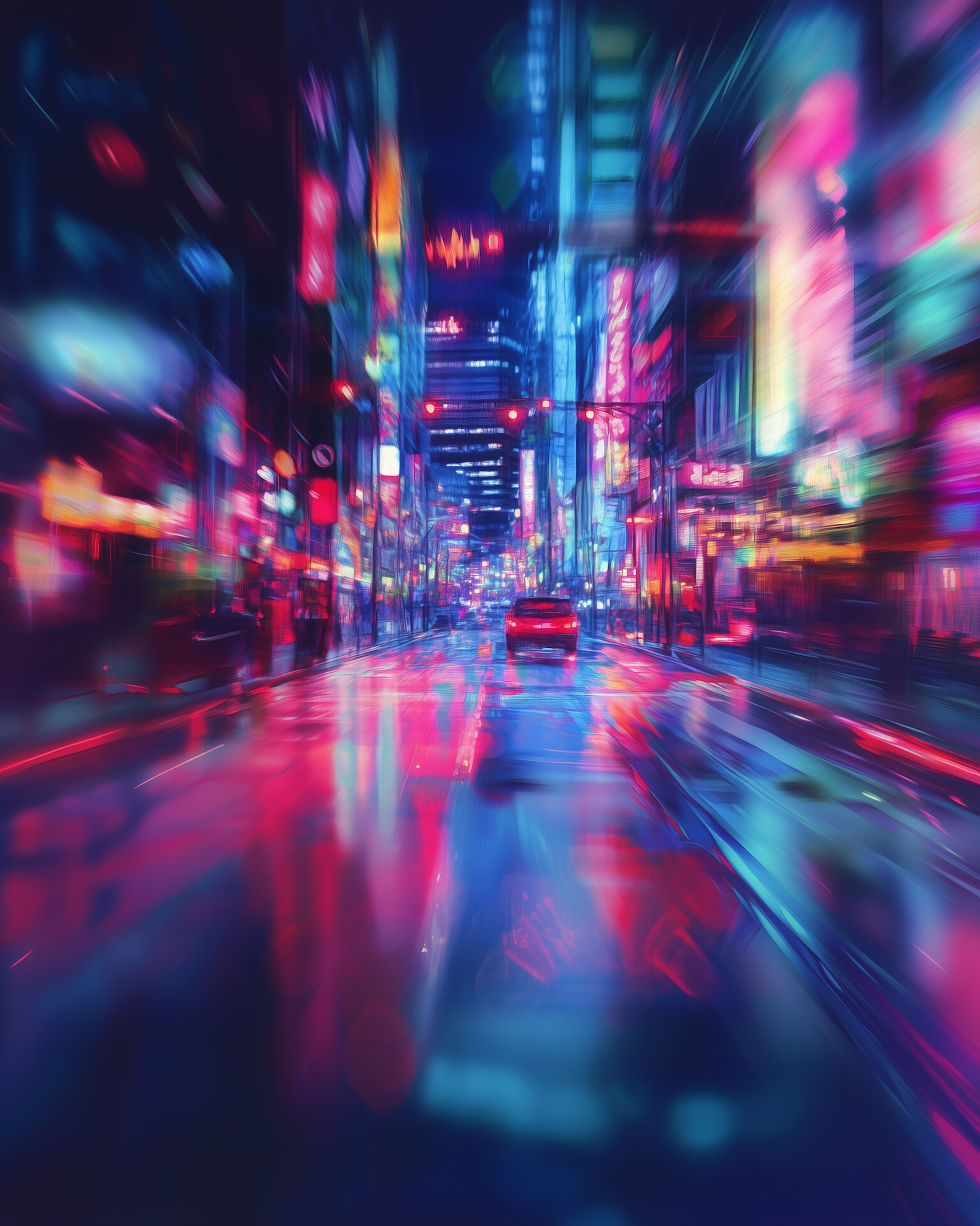 Vibrant city street at night with neon lights and reflections, creating a dynamic, futuristic atmosphere.