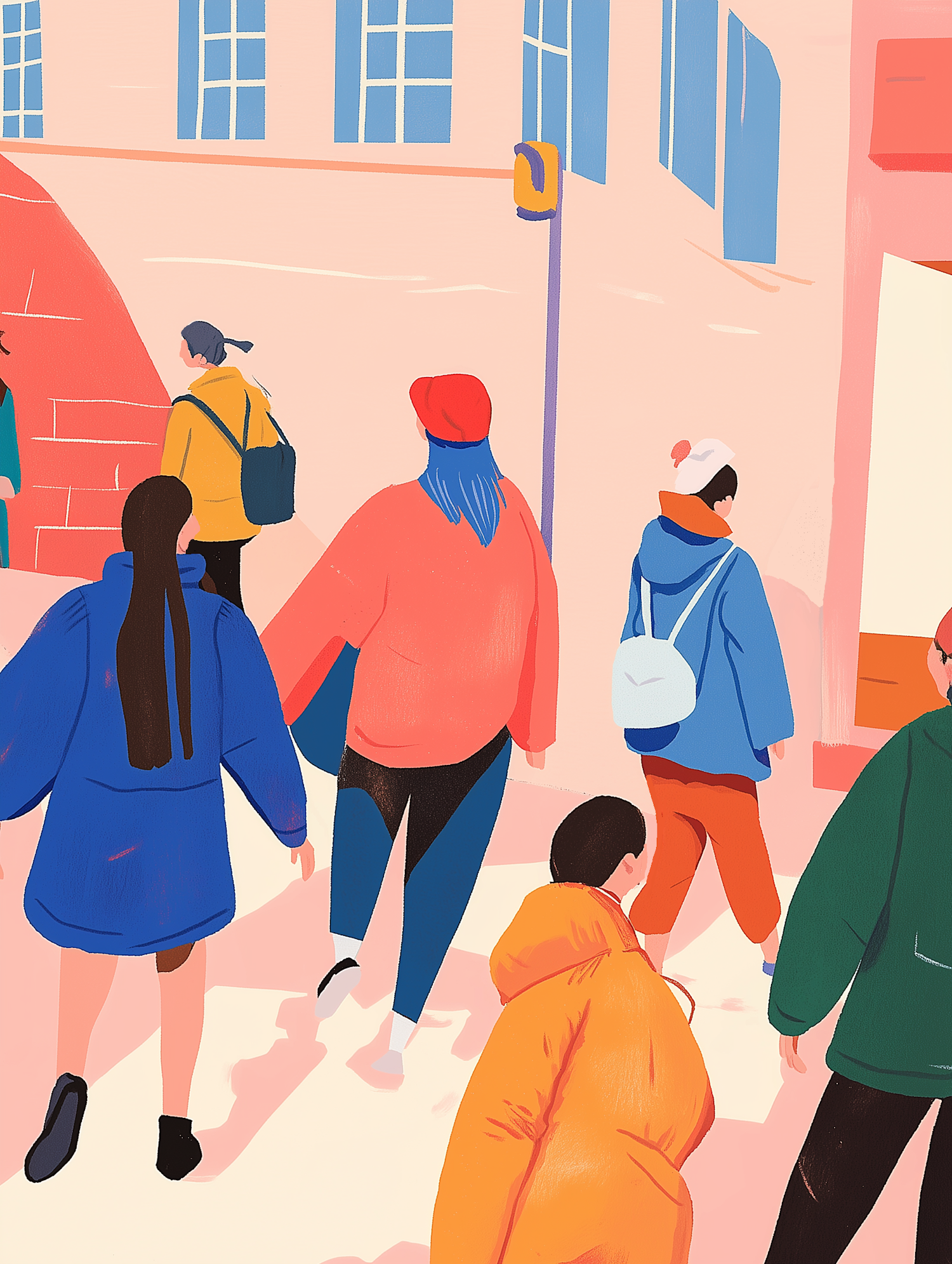 Colorful illustration of people walking in a city, featuring vibrant clothing and a lively urban backdrop.