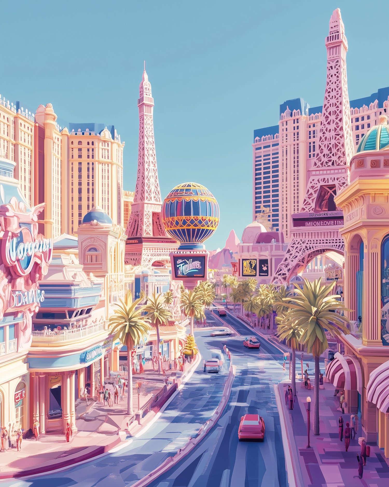 Stylized Las Vegas cityscape with pastel tones, iconic landmarks, palm-lined streets, and a lively atmosphere full of people and cars.